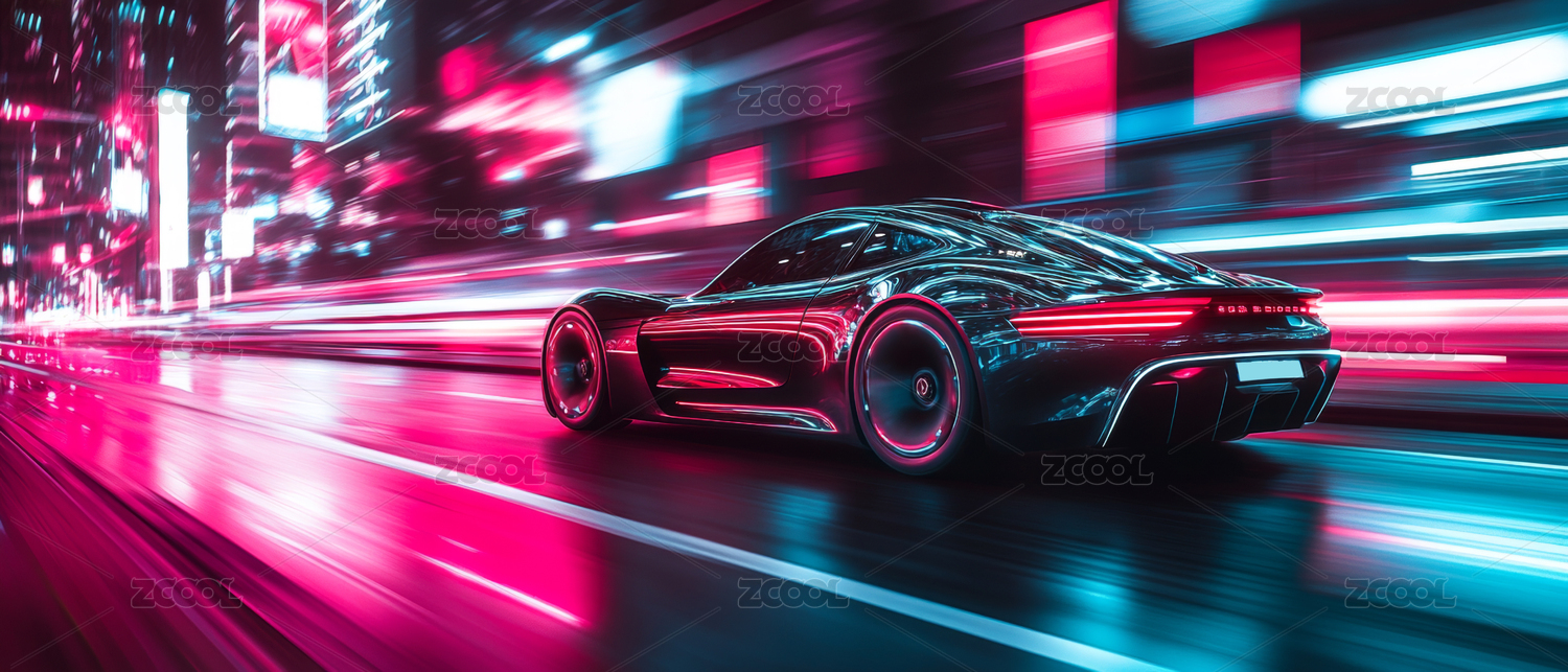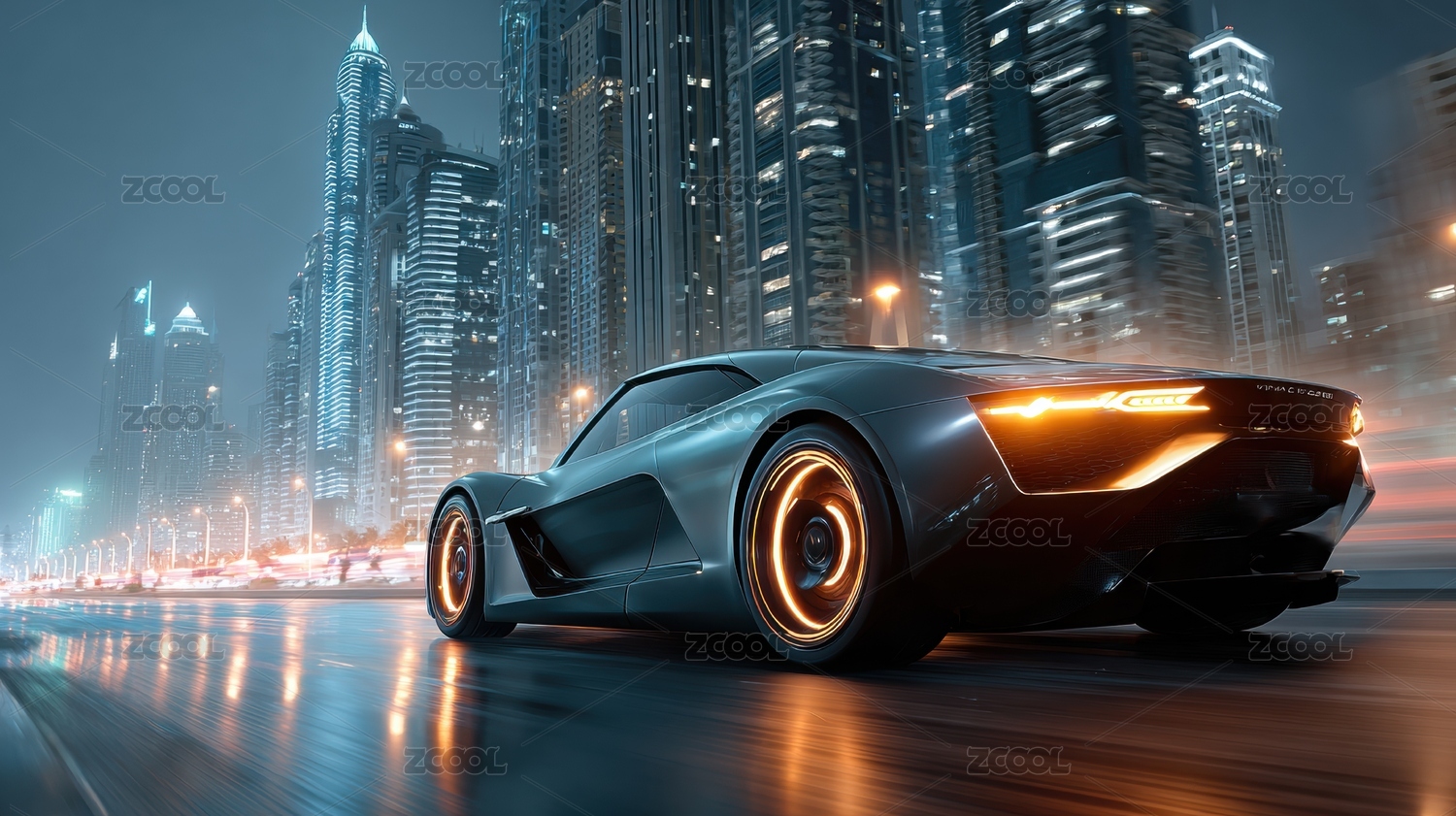 疾驰的蓝色轿车穿梭于流光溢彩的城市夜景