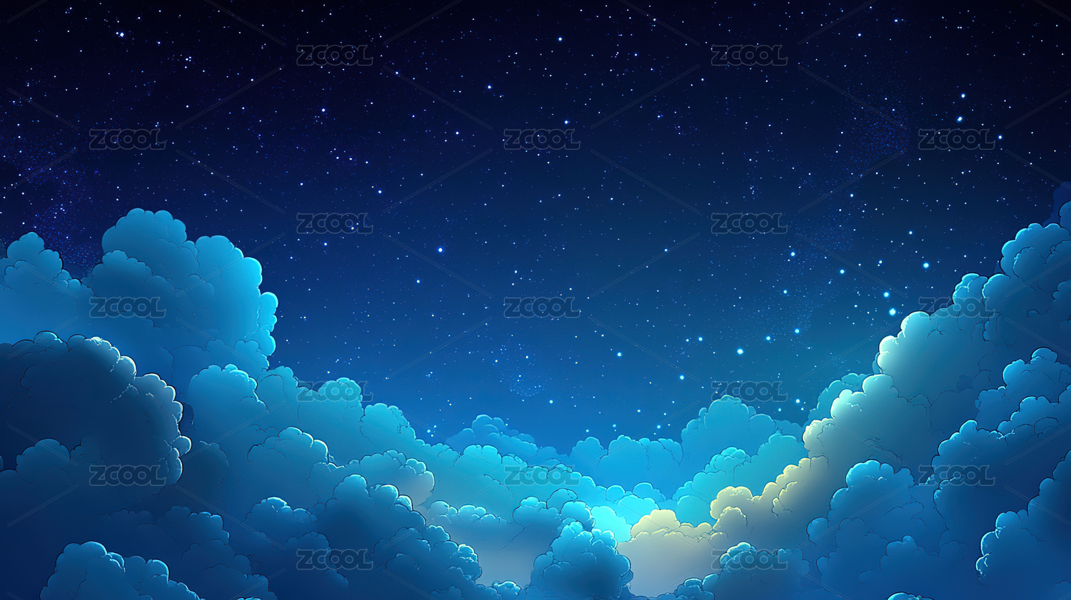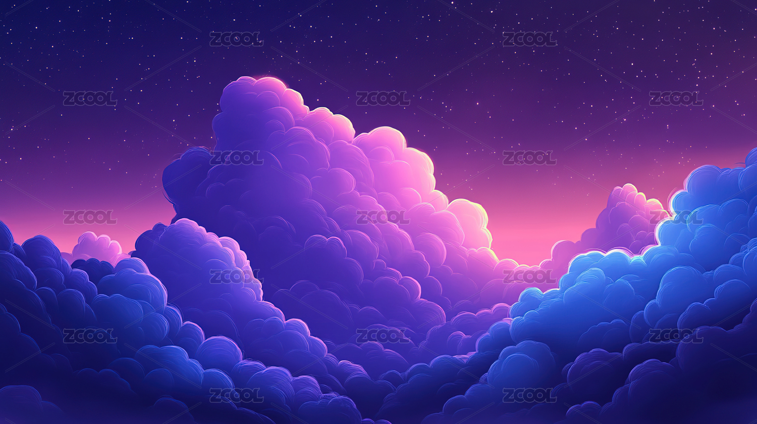 晚上晴朗蓝色星空下彩色发光的云3D插画