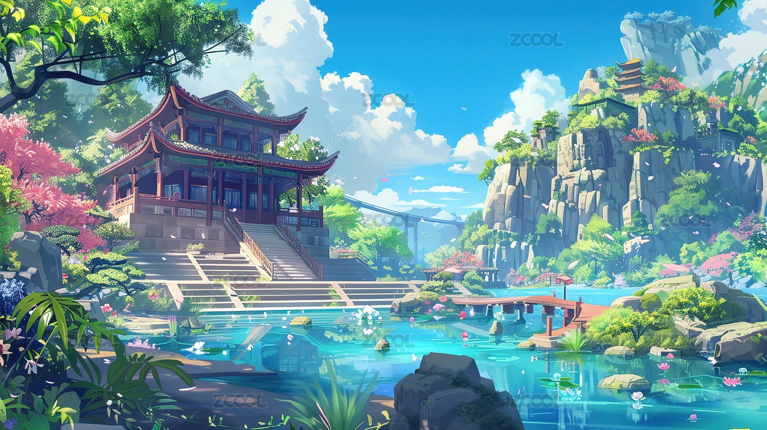 古风仙侠门派仰视写实场景游戏概念原画插画