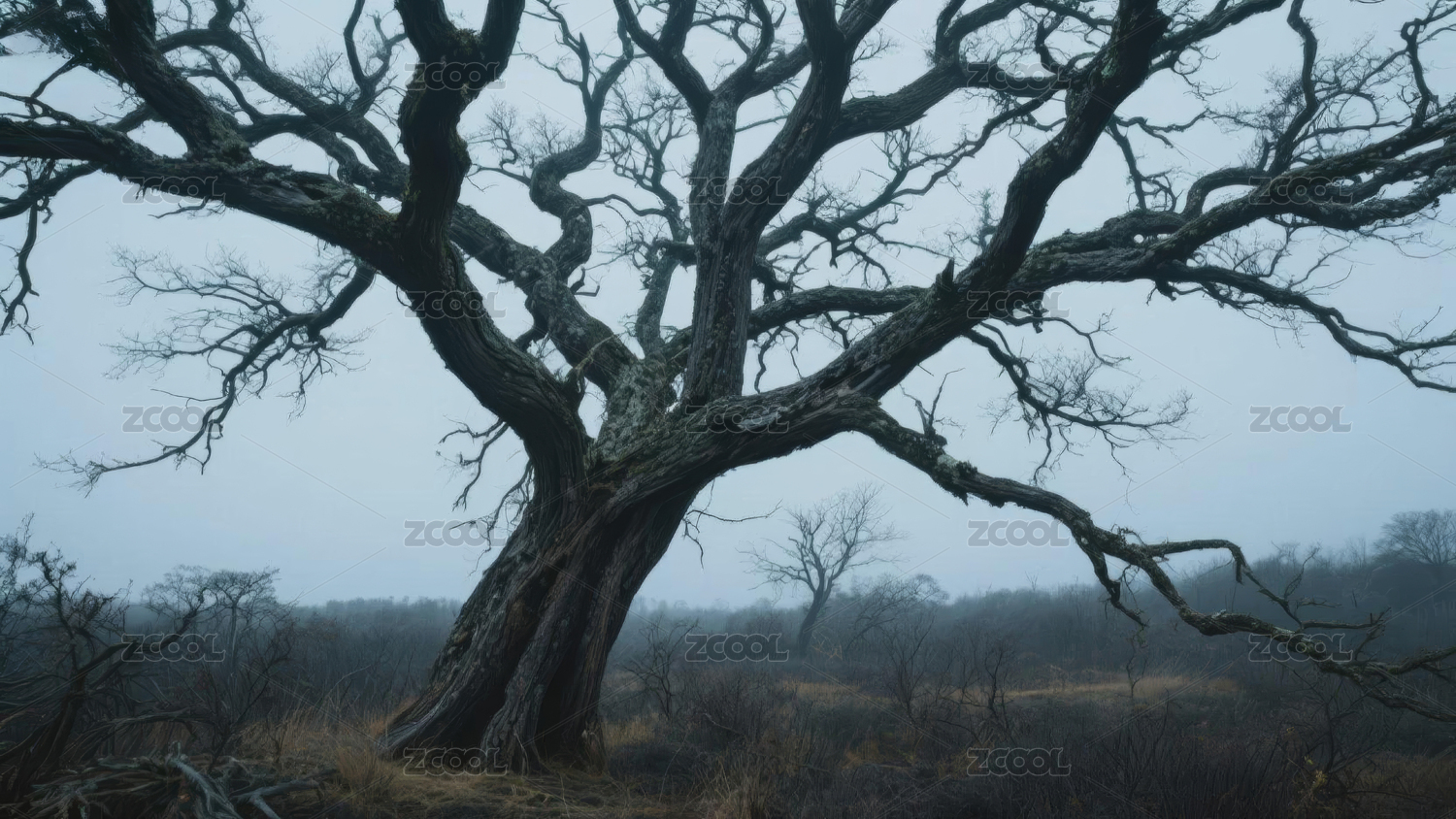 广东省阳江市阳春双滘鸡笼顶风光,迷雾中的枯树