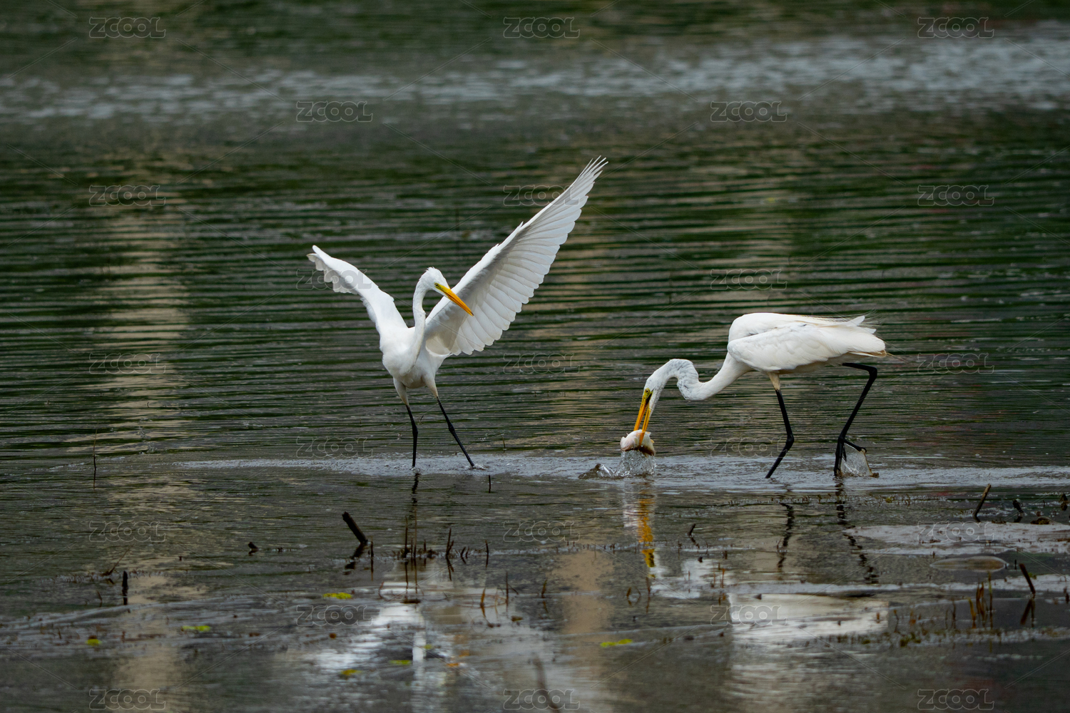 秋天阳光下池塘里的白鹭在嬉戏和捕食