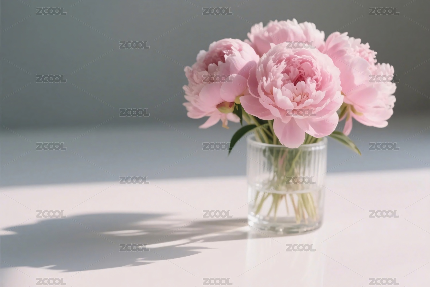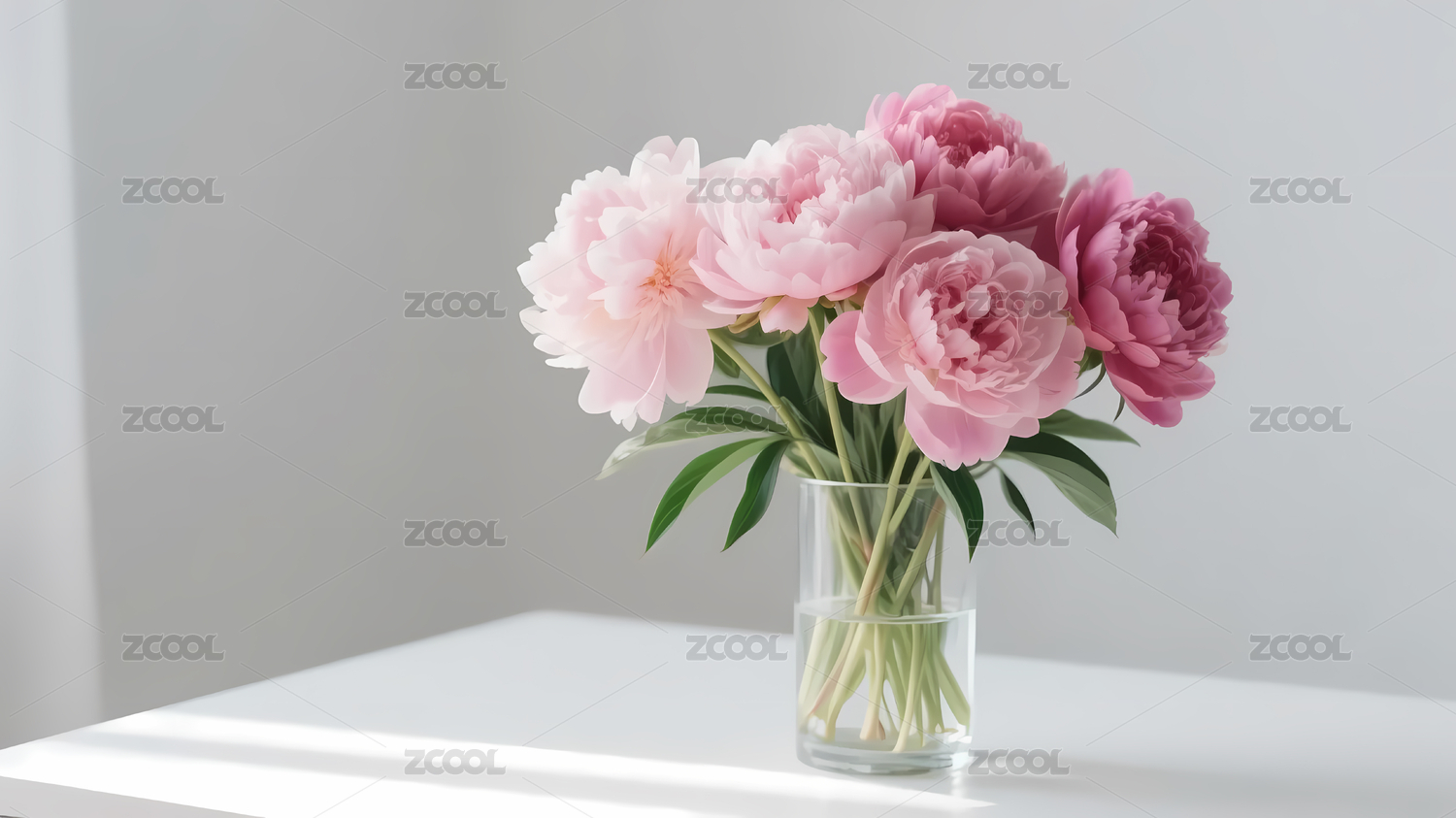 粉色牡丹插于透明花瓶静置桌面