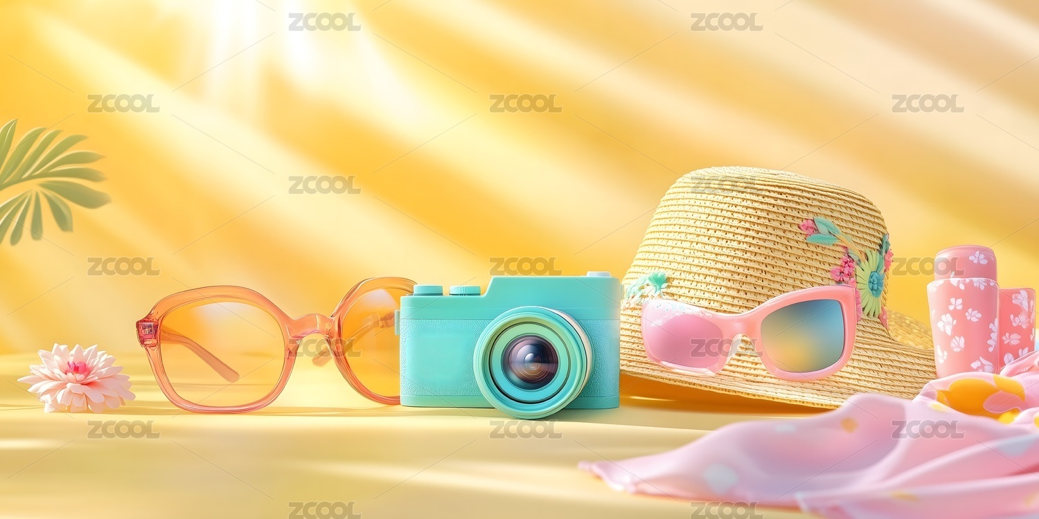 花朵,阳光,沙滩,帽子,眼镜,相机,度假,旅行,钱包,丝巾