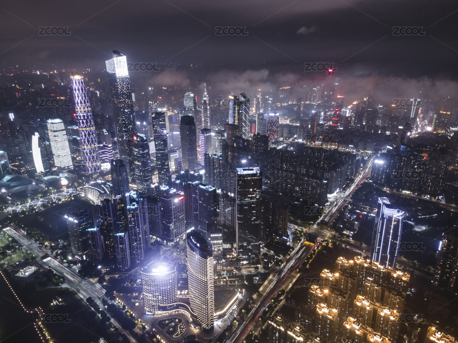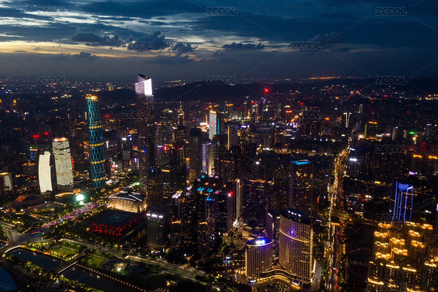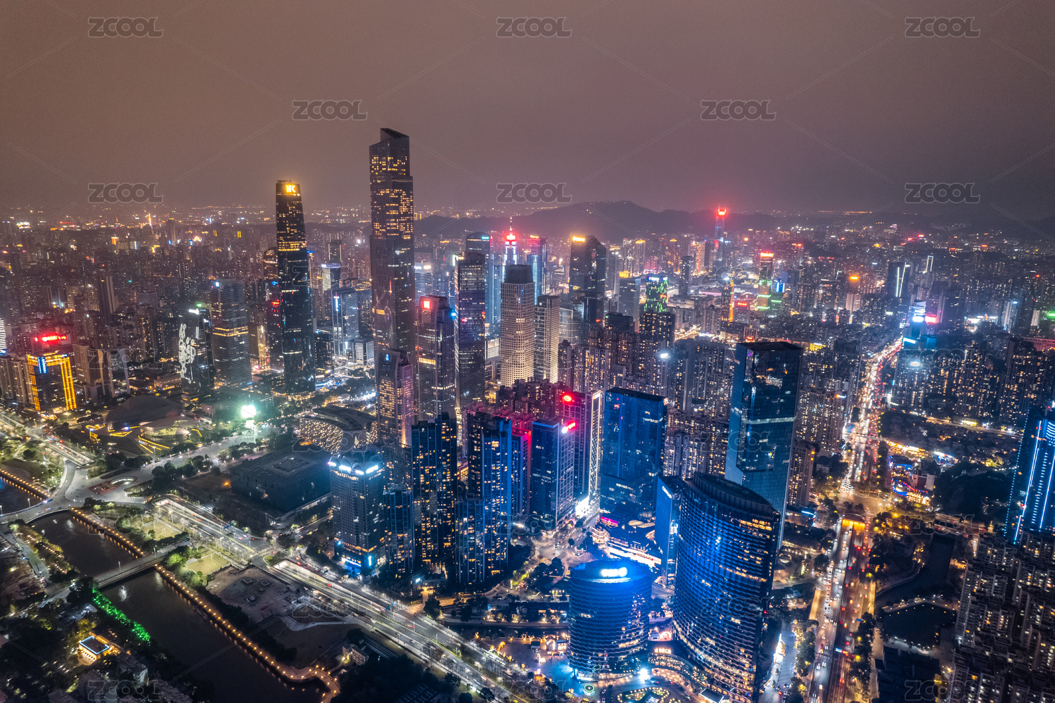 航拍视角的广州珠江新城CBD鸟瞰夜景