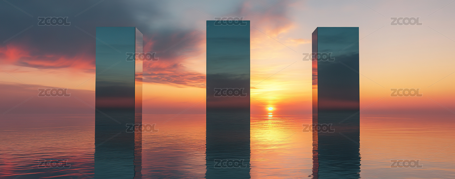 柱子,水面,倒影,日落,色调,渐变,黄色,红色,粉色,夕阳