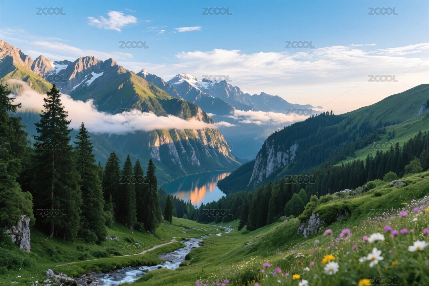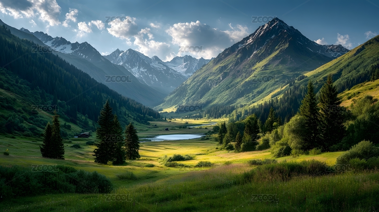 山谷绿意与湖泊风光