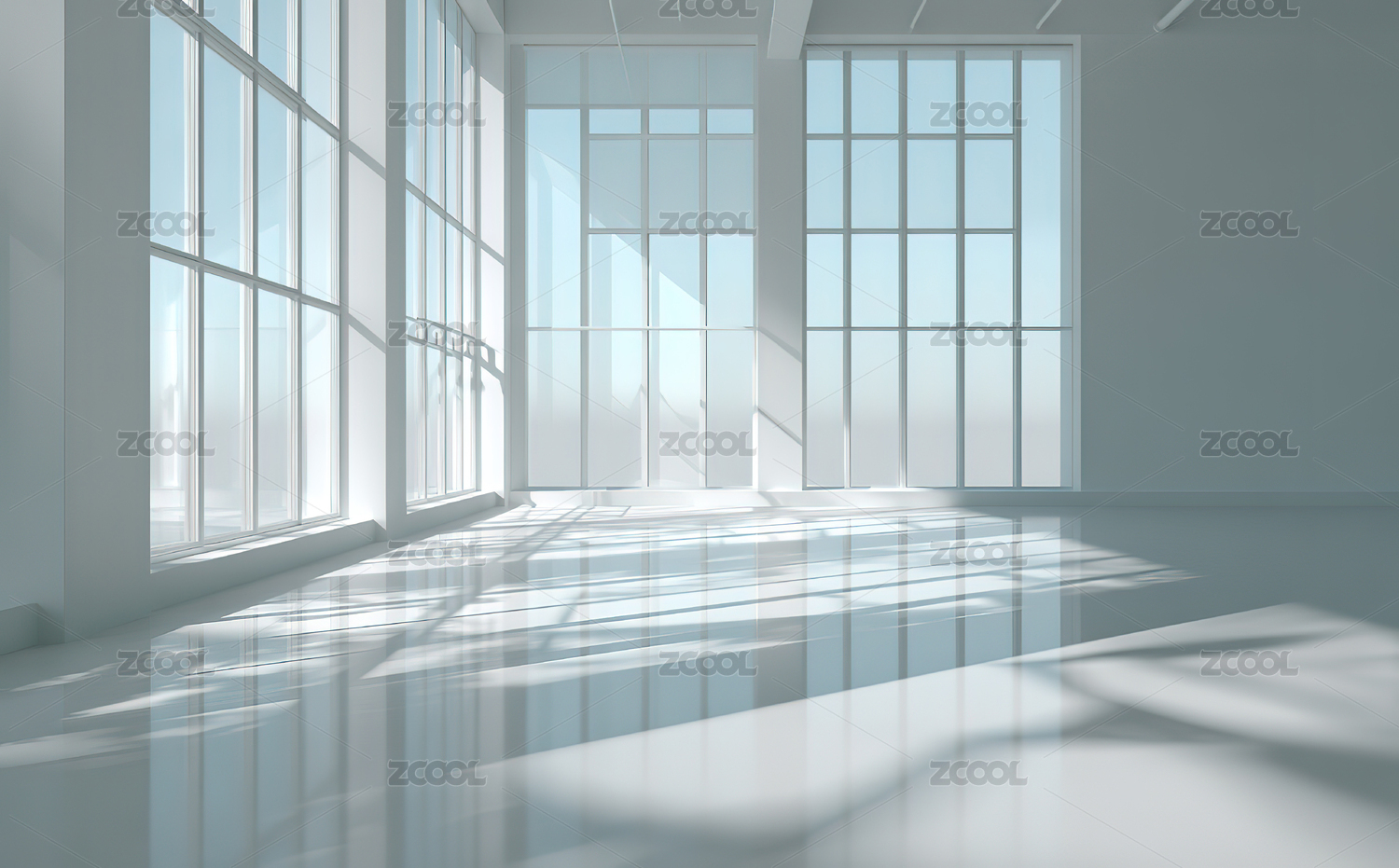 白色的房间,有窗户,地板上有阴影