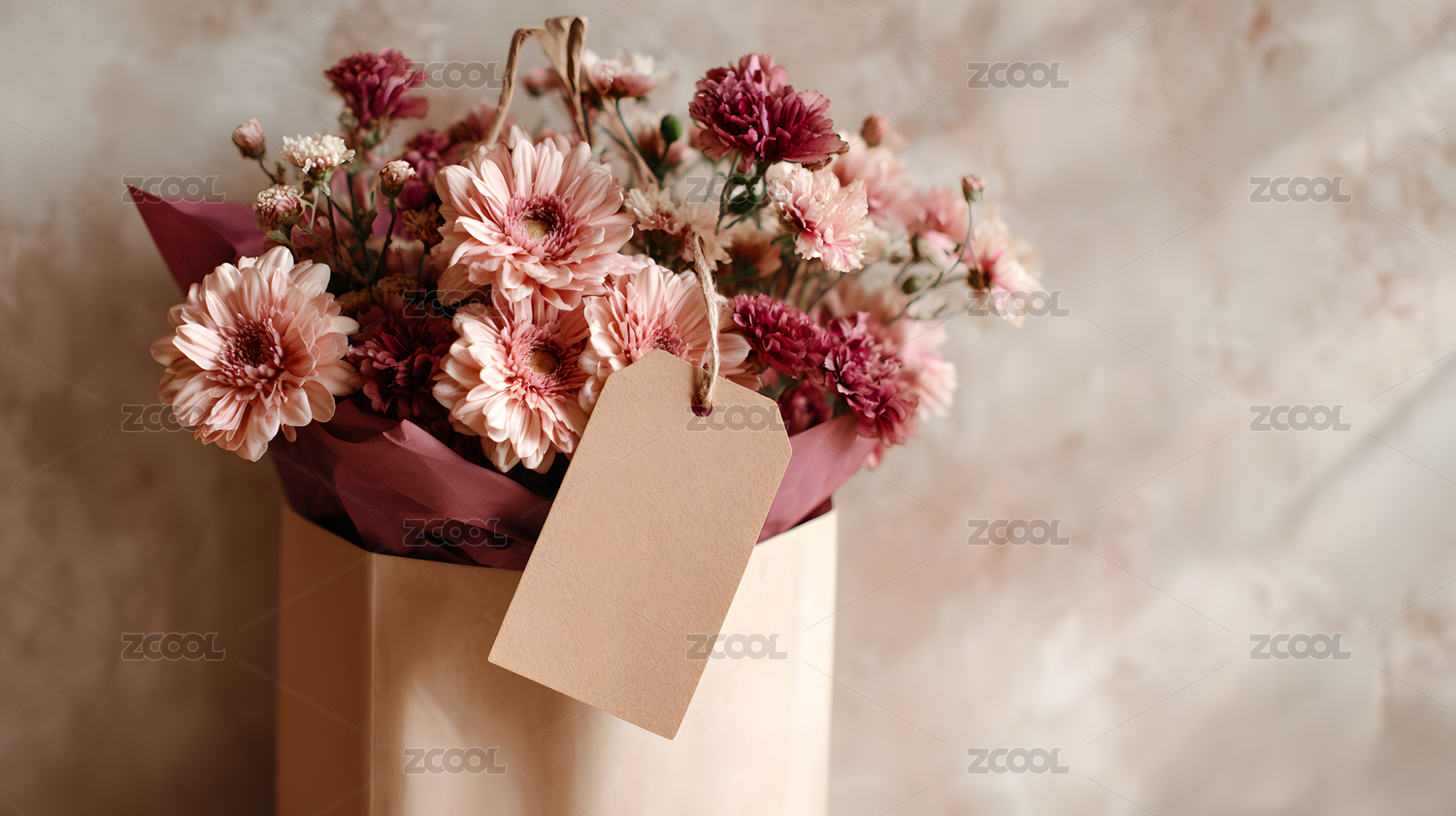 粉背景前牛皮纸包裹的多彩花束
