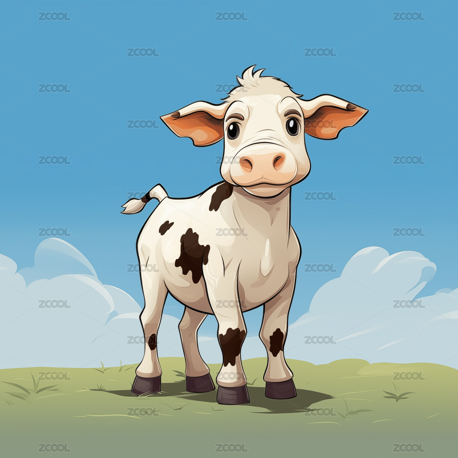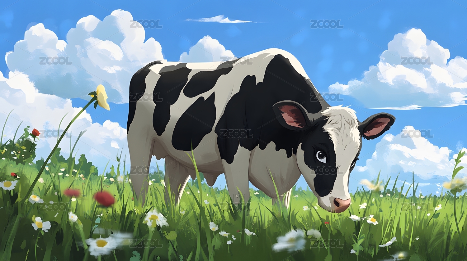 可爱卡通牛站在花草蓝天间