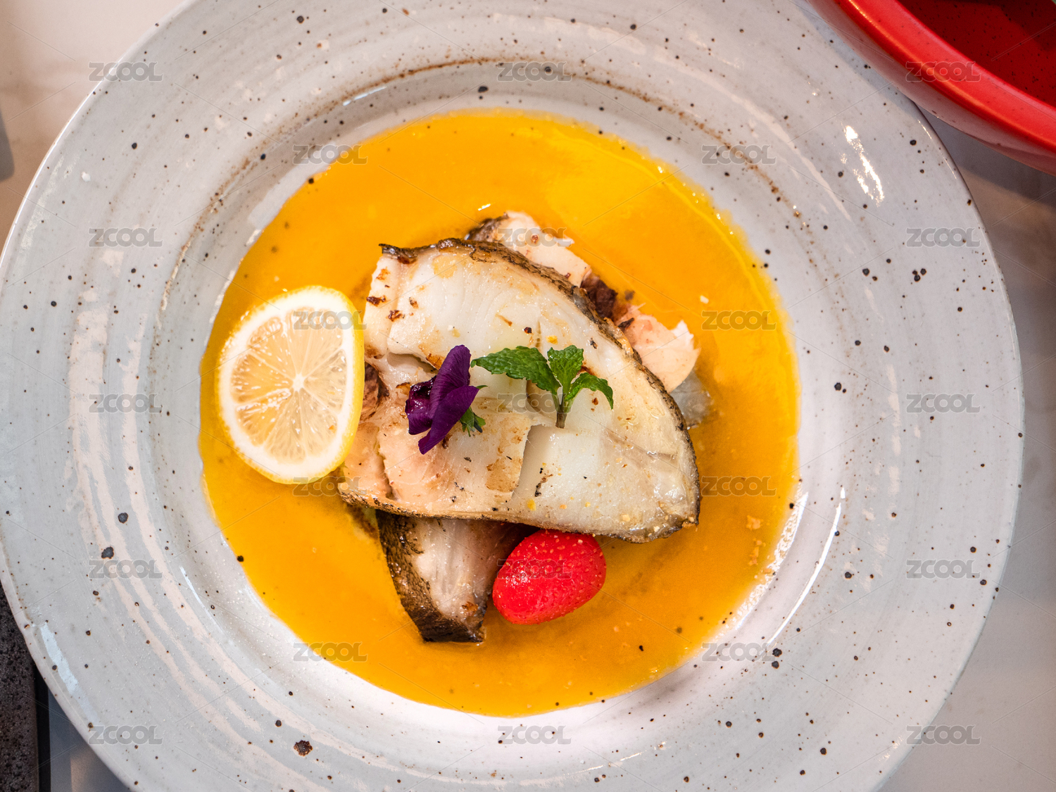 桌面上的盘子里的美味可口的煎鳕鱼扒