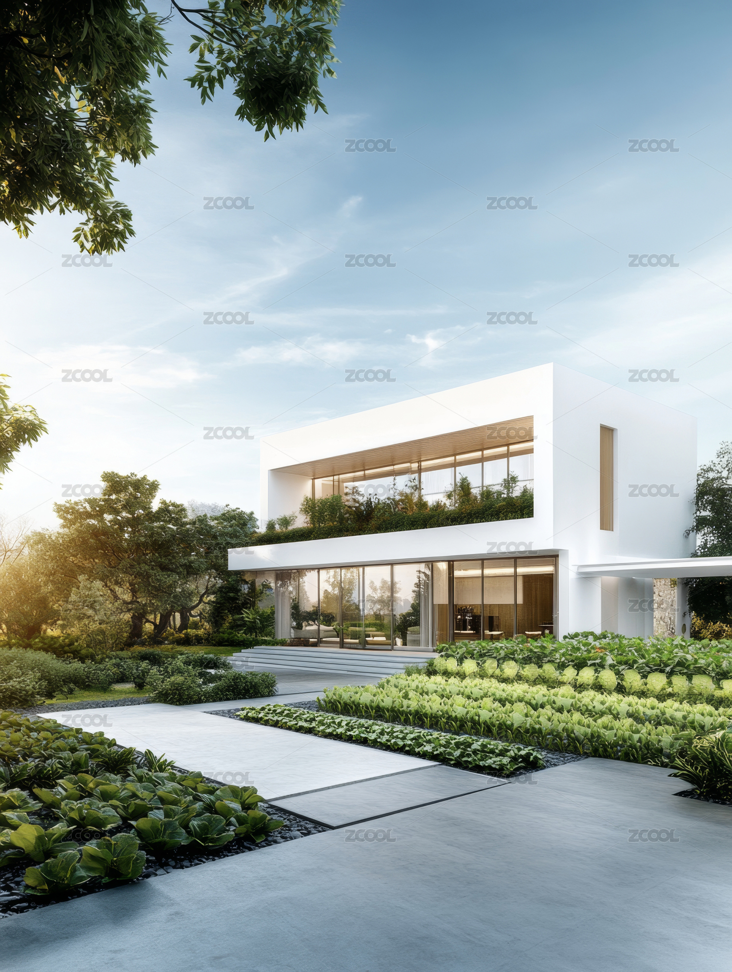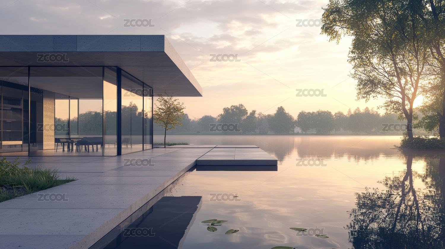 现代,建筑,玻璃,幕墙,草坪,湖景,树木,日落,自然,景观