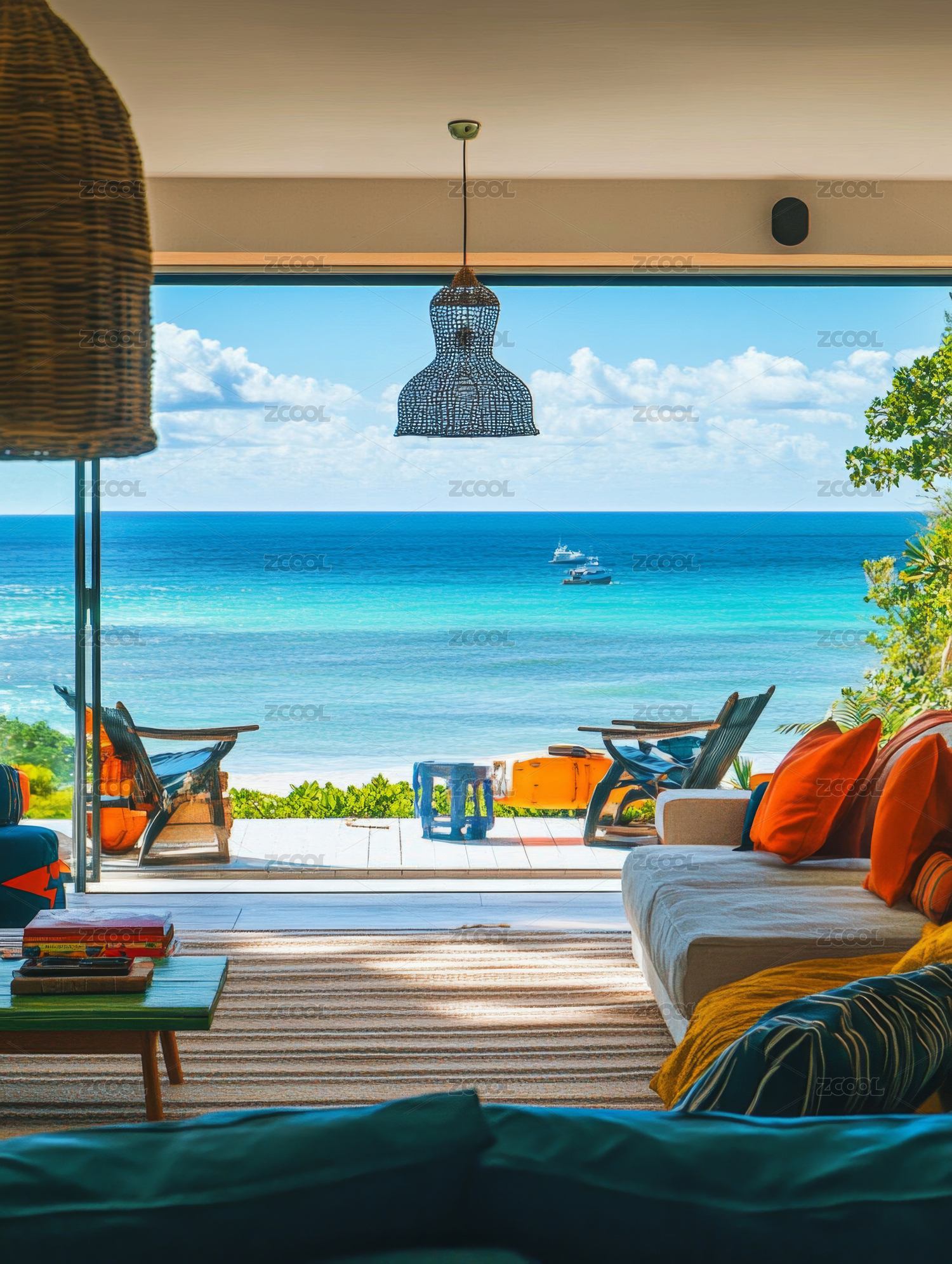 海边,度假,别墅,客厅,沙发,躺椅,海洋,蓝天,白云,植物