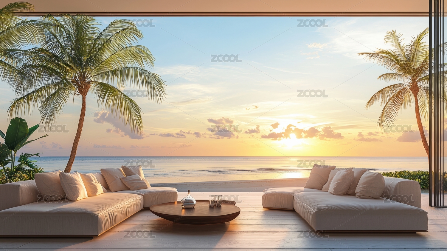 海景落日与室内休闲沙发区