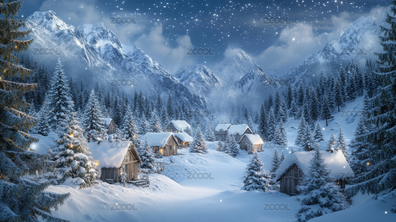 冬日雪山小屋温暖祥和的景象