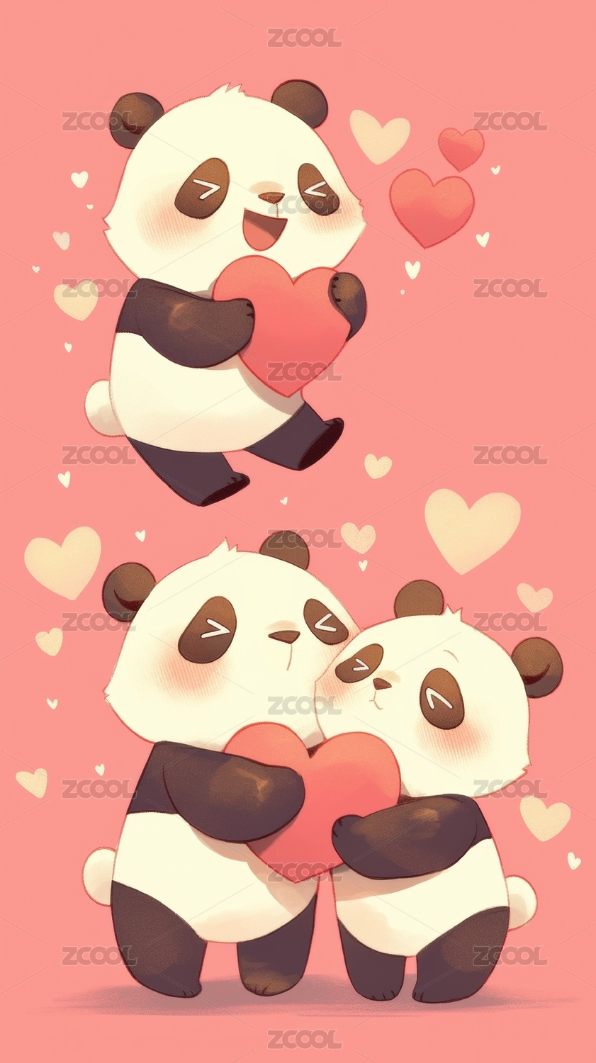 熊猫情侣拥抱爱心温馨粉色背景