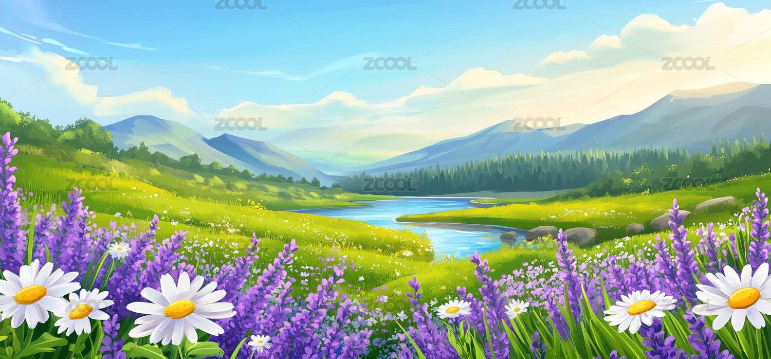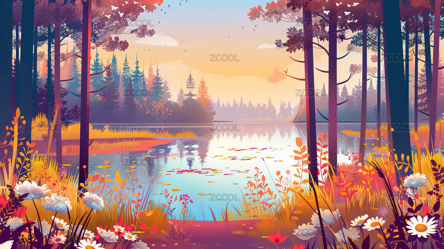 数码水彩湖泊花朵树木风景抽象图形海报背景