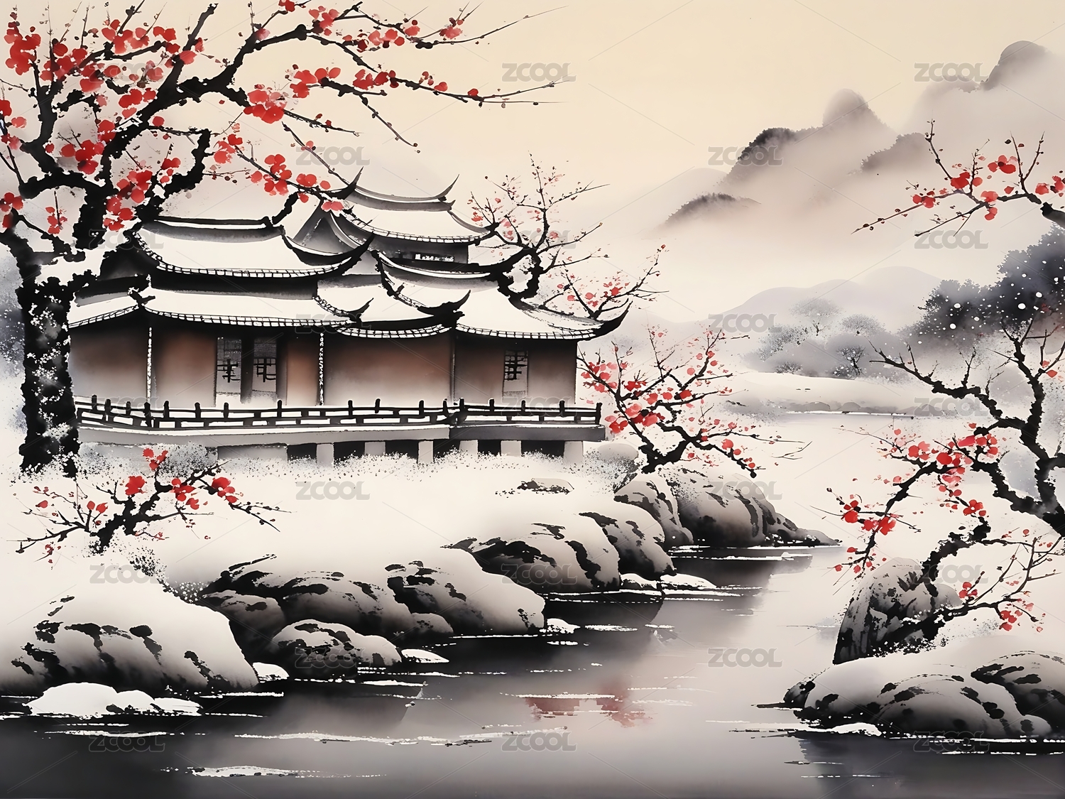 中式,雾气,亭子,山峰,宁静,自然,雪景,松树,红漆,建筑
