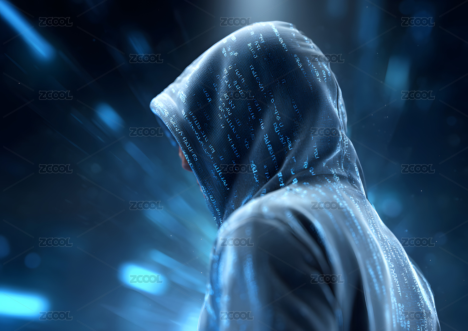 神秘黑客身着连帽衫,置身数字信息流之中