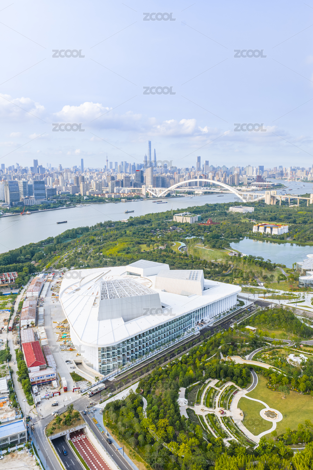 航拍上海世博文化公园卢浦大桥陆家嘴城市天