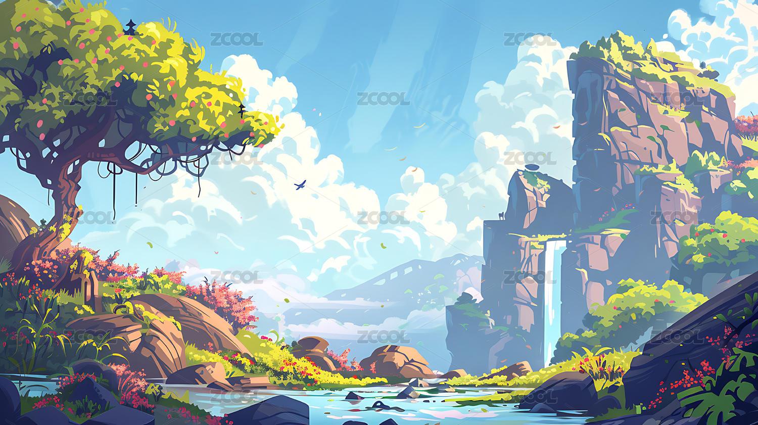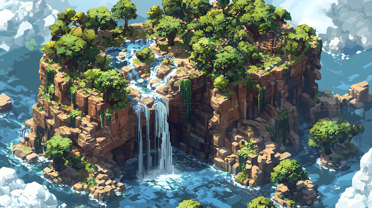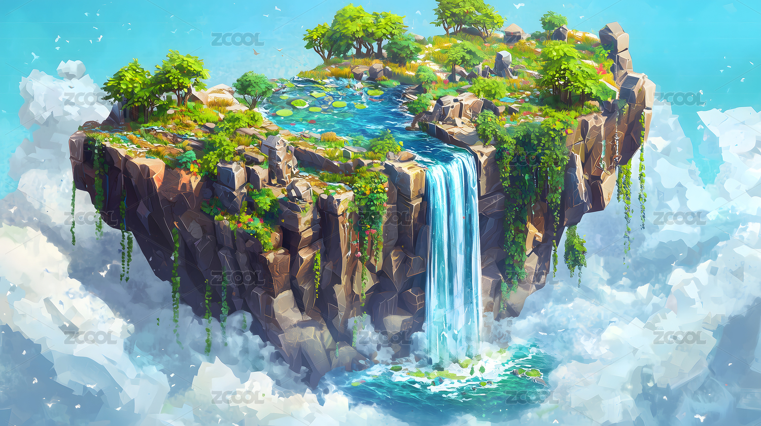 漂浮,岛屿,低多,边形,卡通,景观,自然,绿色,水景,清新
