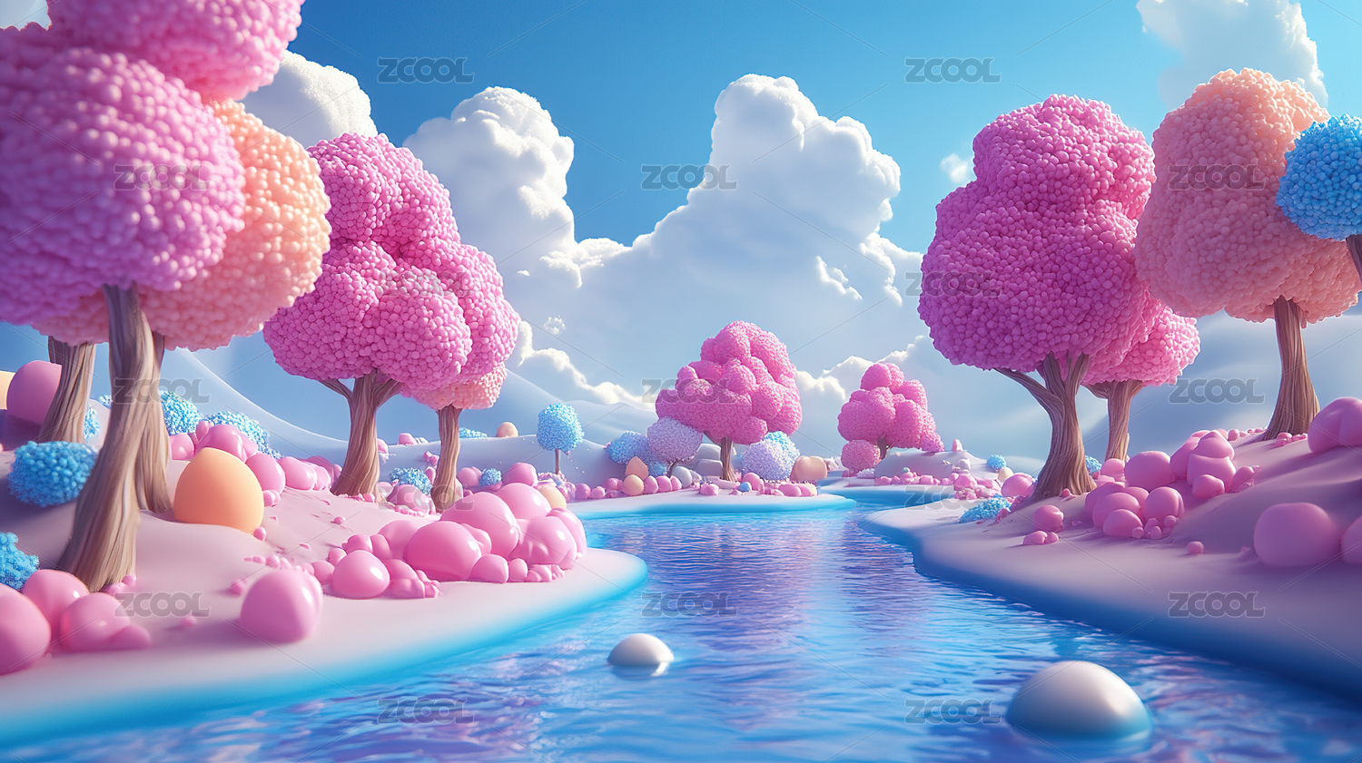 糖果色,梦幻,田园风光,童话世界,棉花糖,卡通,可爱,树木,小山丘,治愈系