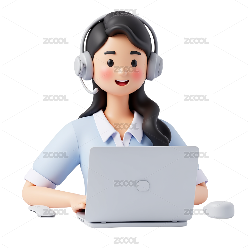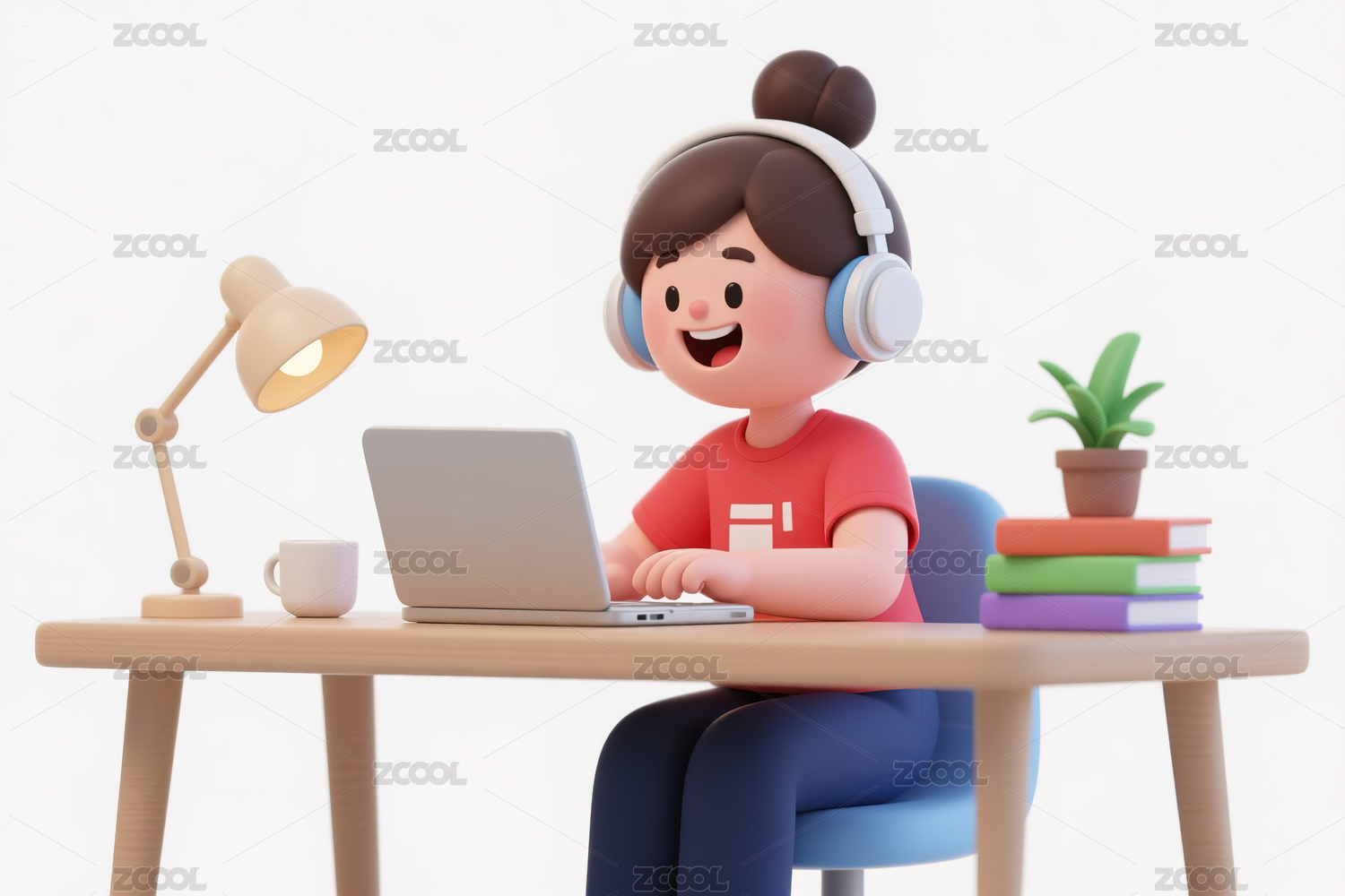 戴着耳机使用笔记本电脑工作学习的3d插画