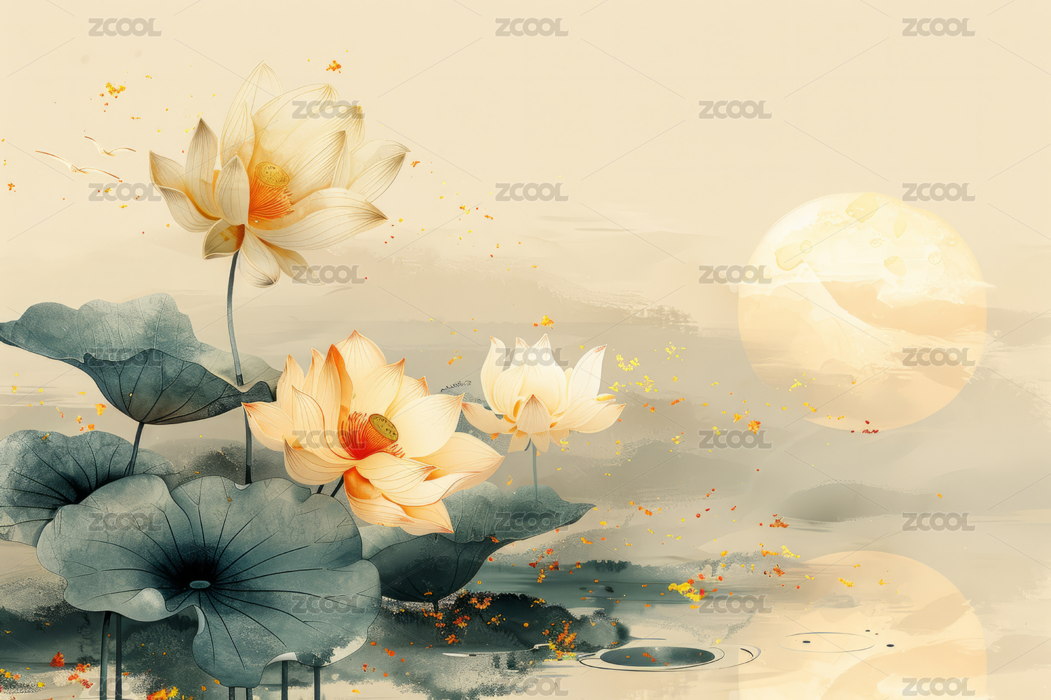 荷花,莲花,清新,壁纸,夜色,月亮,流线,金色,花瓣,花香