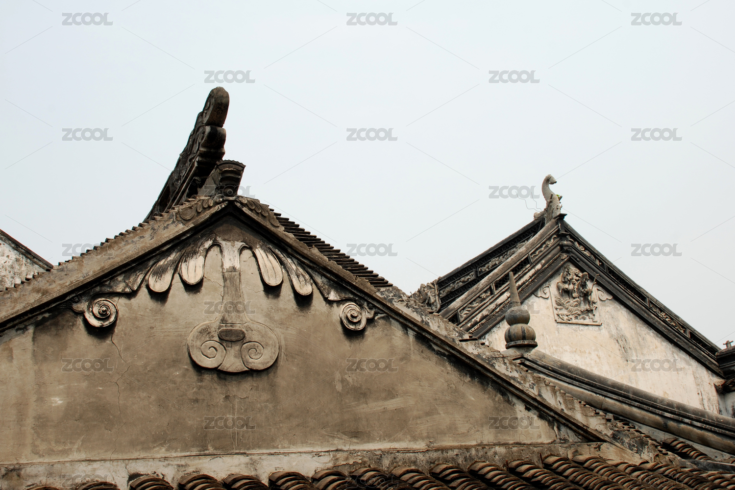 中国浙江宁波慈城火神庙硬山顶正脊、山墙与青瓦特写