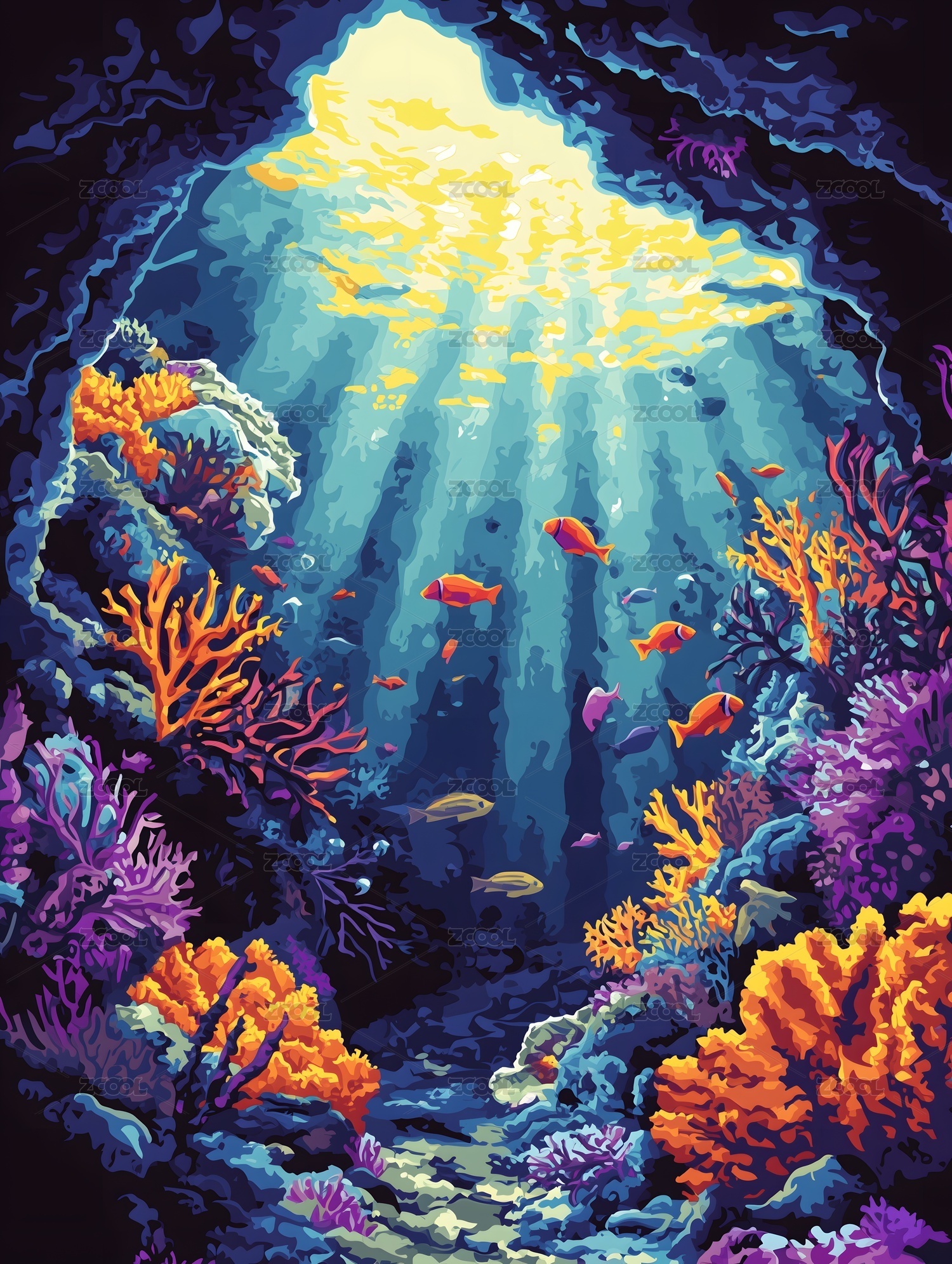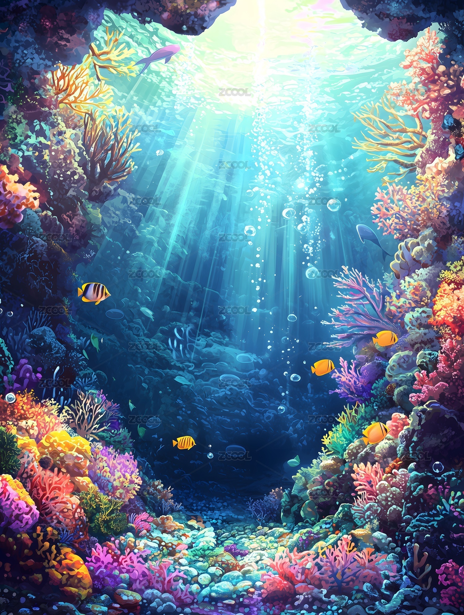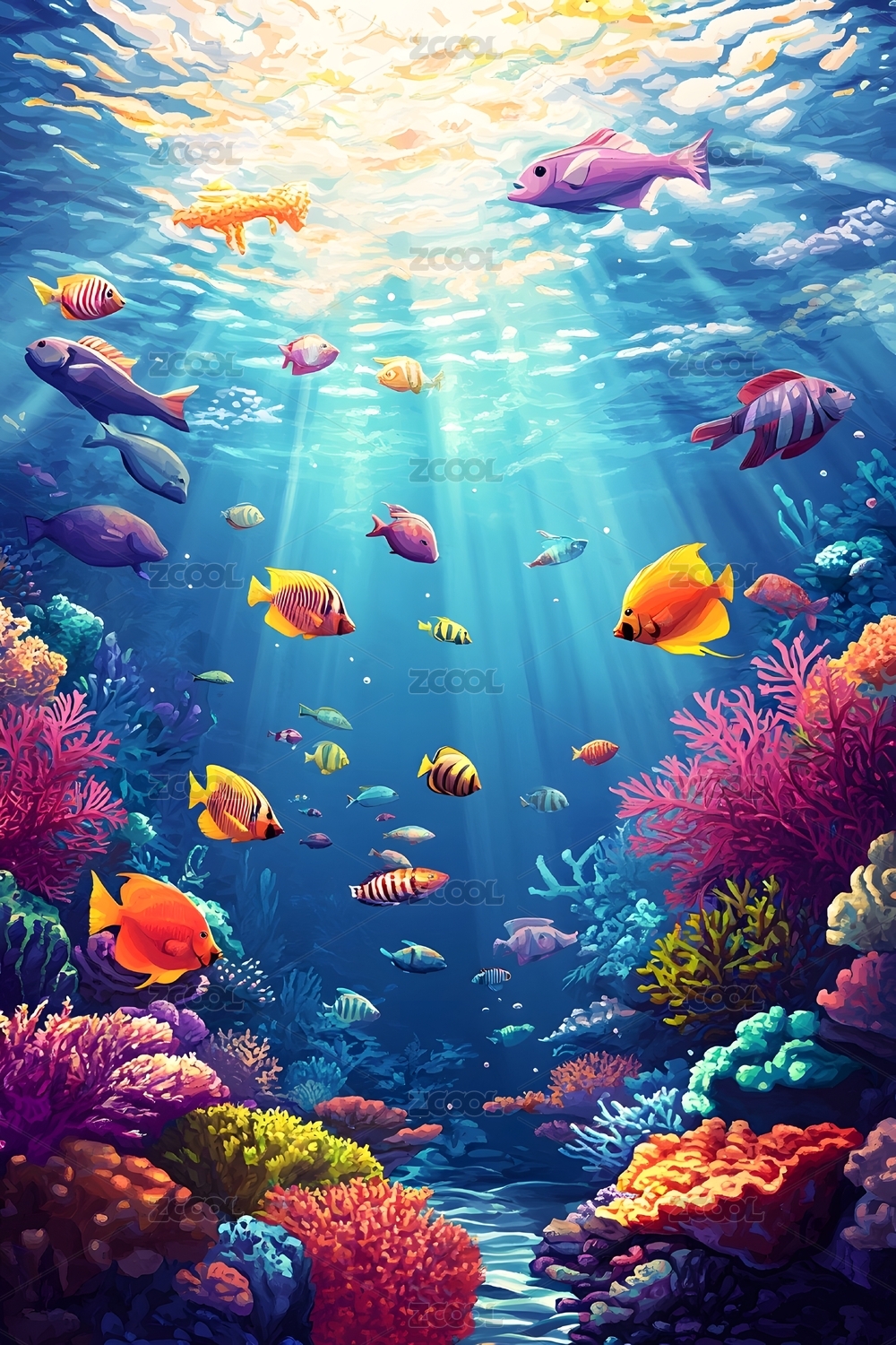 阳光下的五彩热带鱼穿梭珊瑚礁
