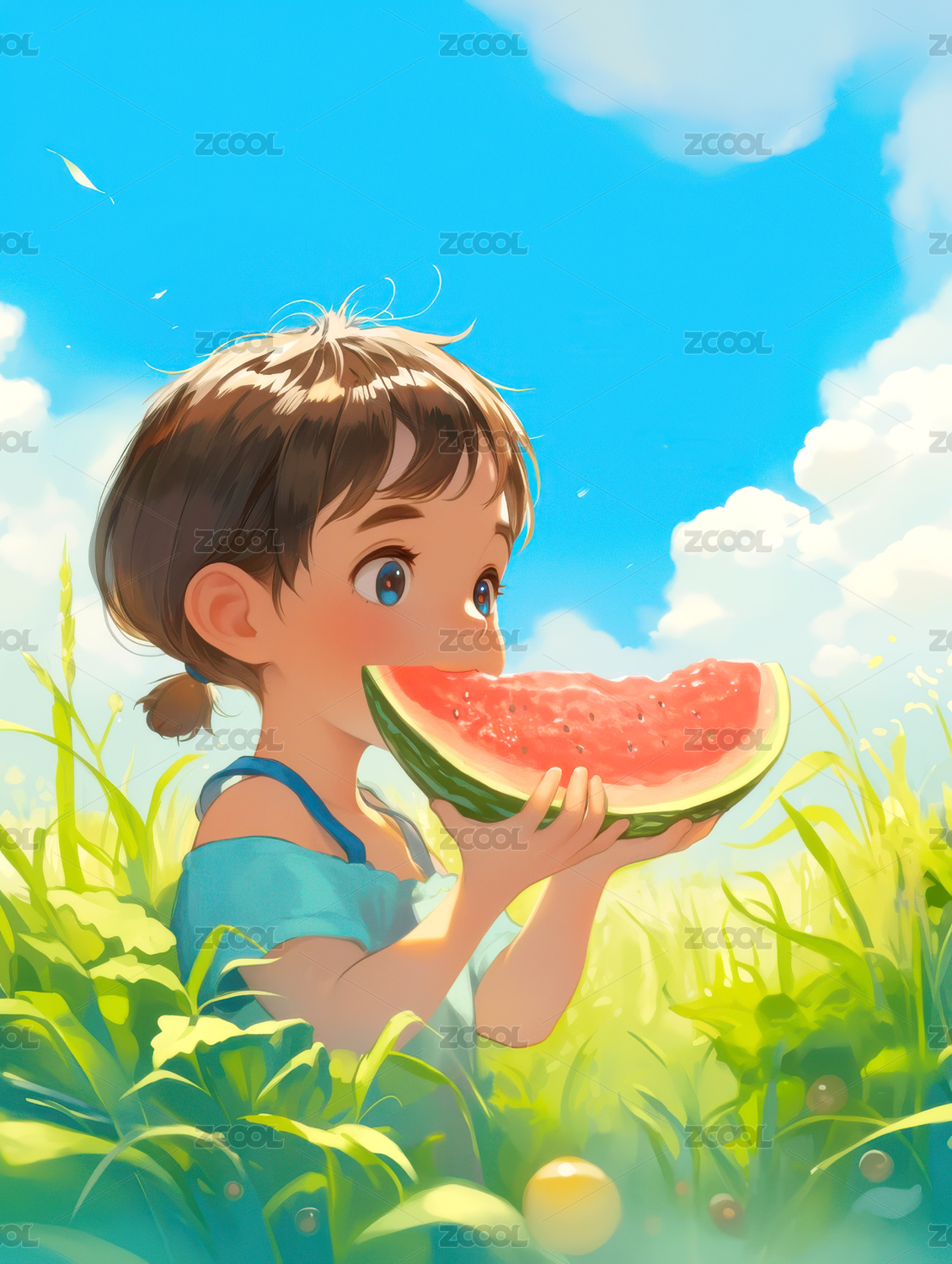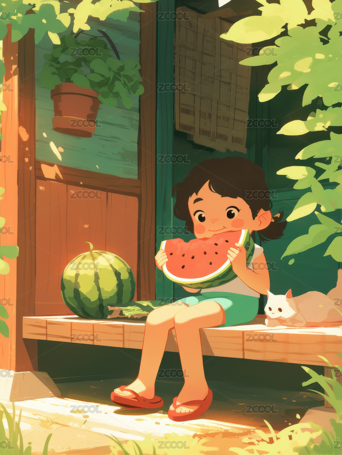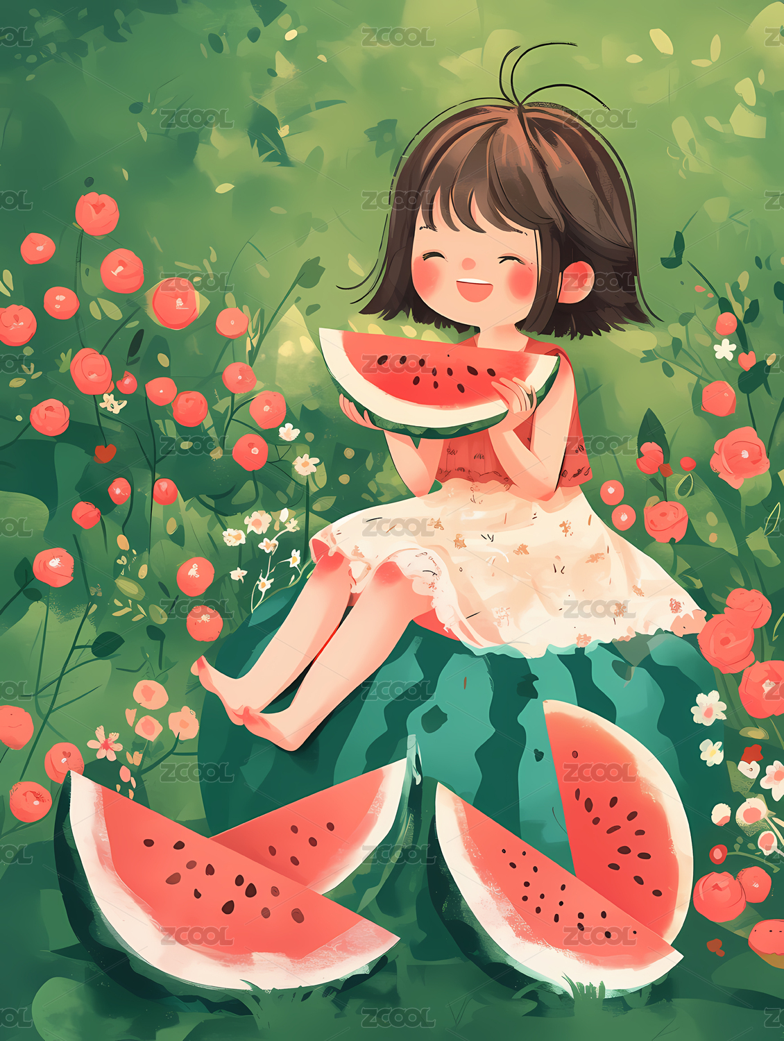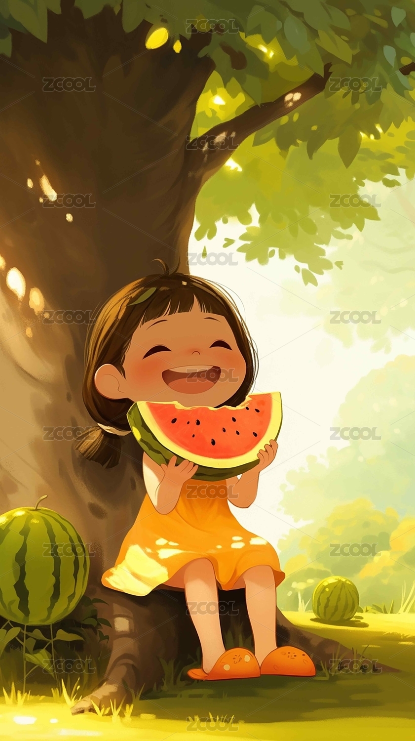 小女孩吃西瓜卡通插画