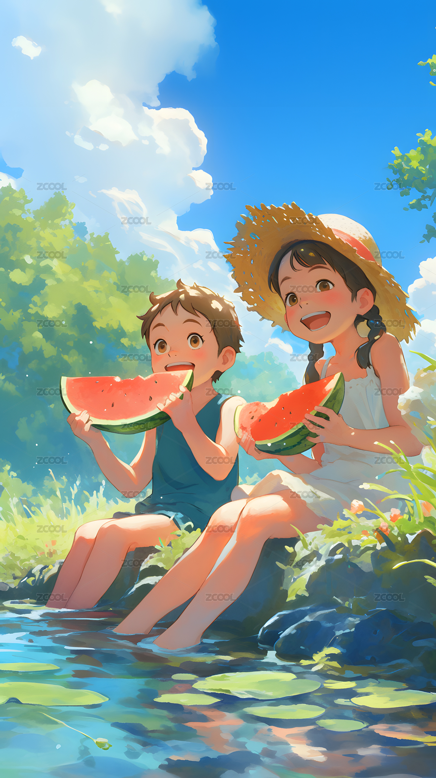 夏日清凉西瓜男孩女孩溪边