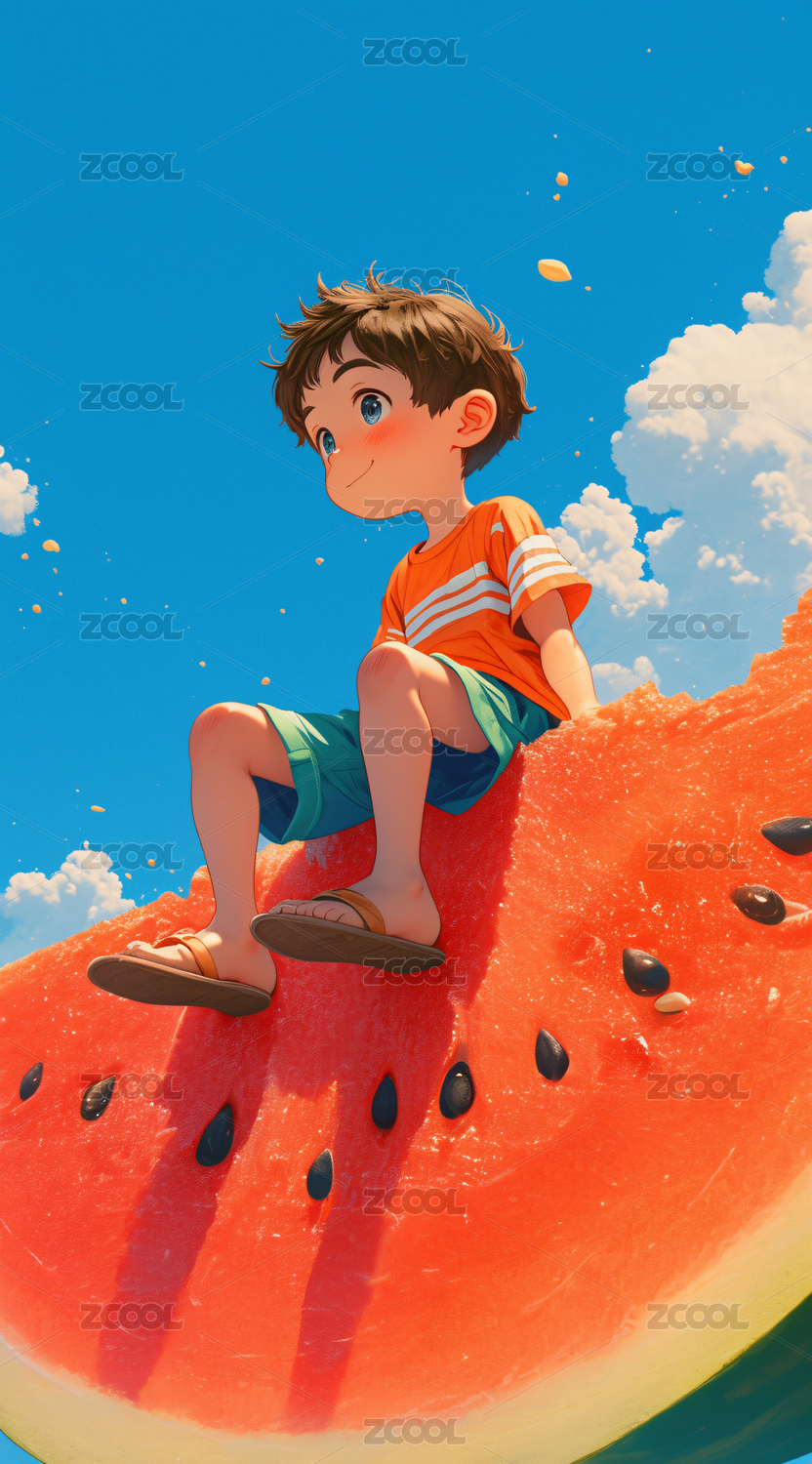 坐在西瓜上的小女孩