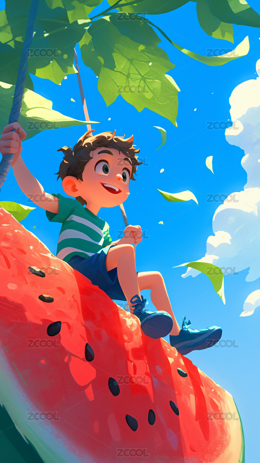 夏日吃西瓜卡通插画