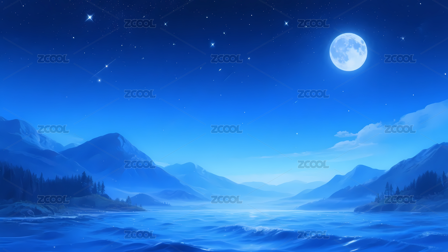 满月与星空映衬海洋山脉
