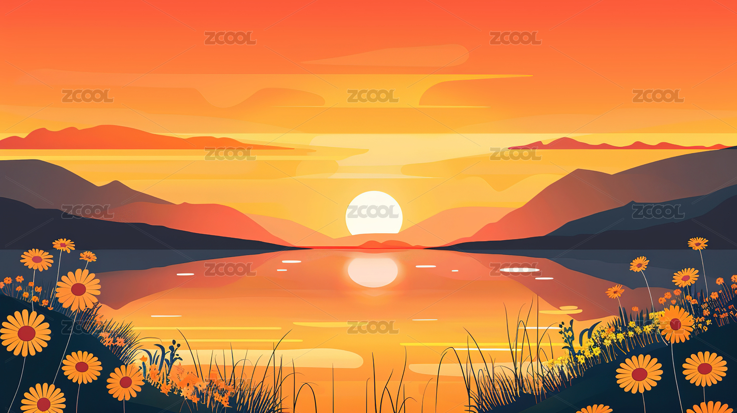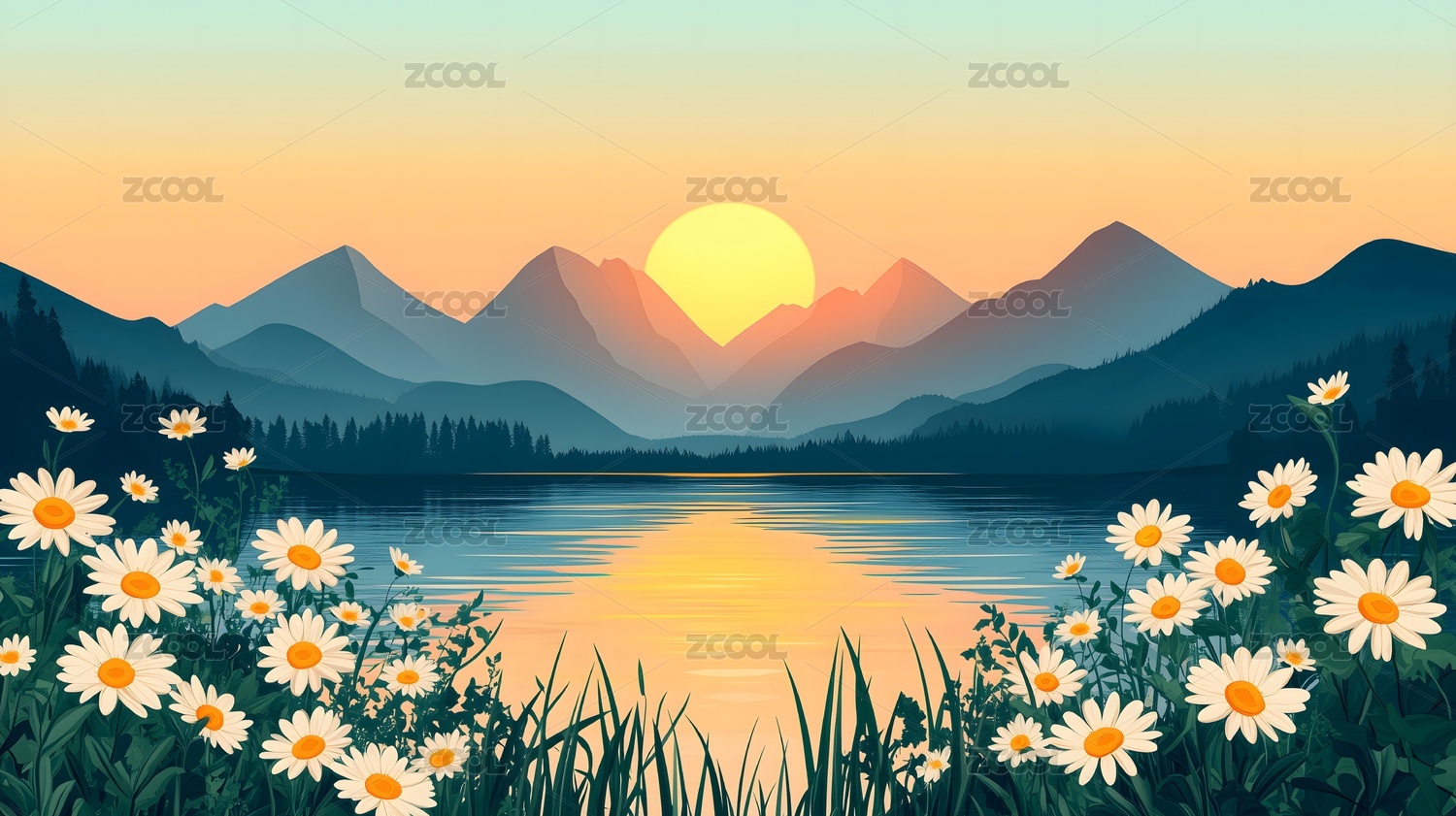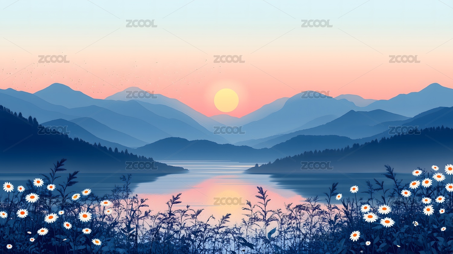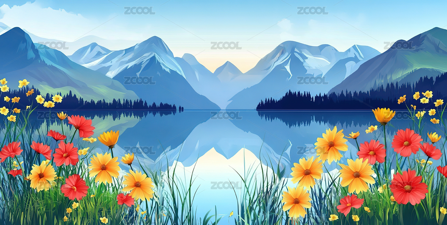 插画,高山,地形,自然美,AI数字艺术,背景,天空,季节,湖,水