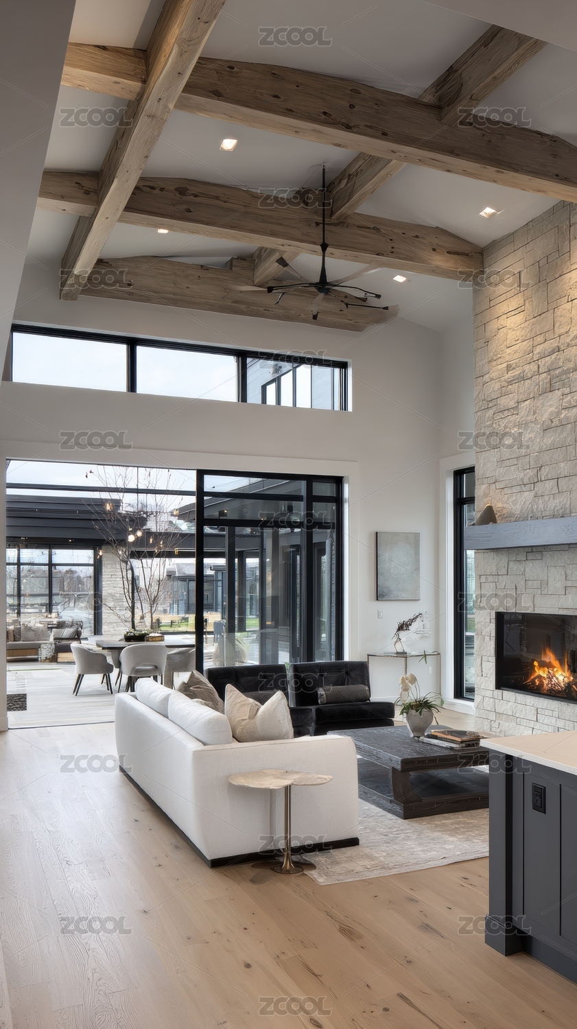 客厅,石头,壁炉,木质,横梁,现代,家具,舒适,自然,光线