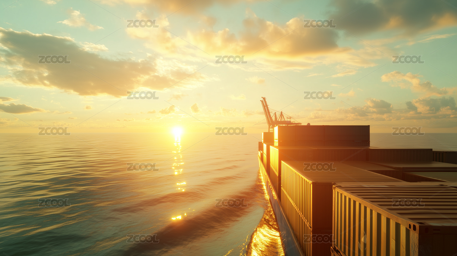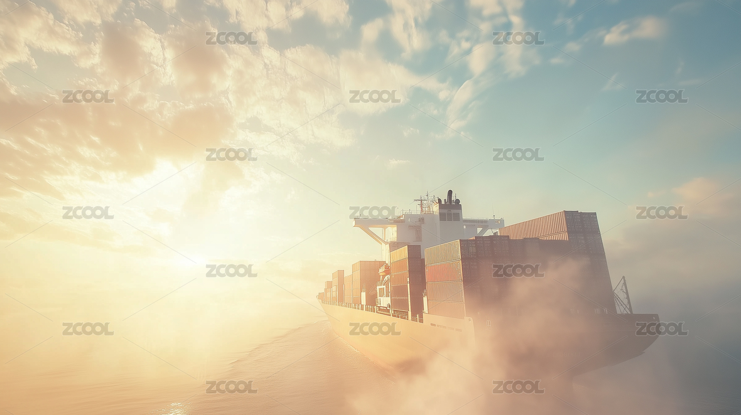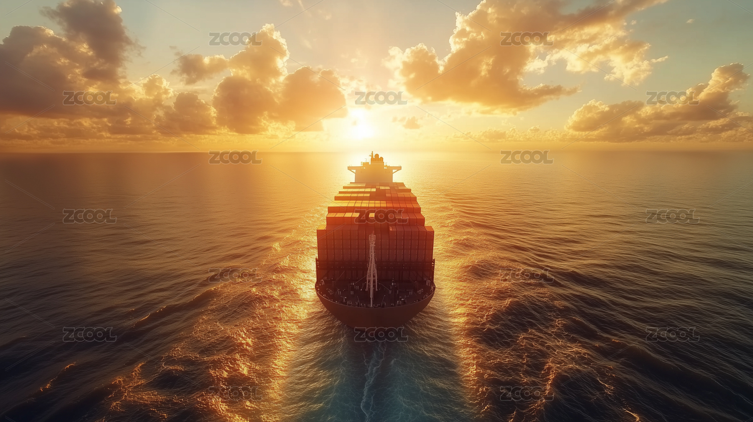 夕阳下大海中行驶的货轮背景