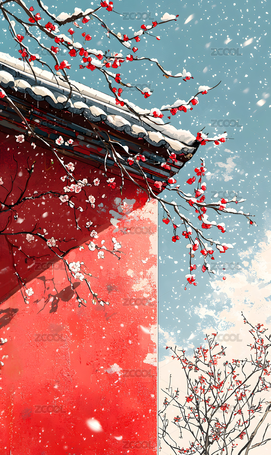 中式红墙古建筑冬季大雪纷飞雪景插画插图