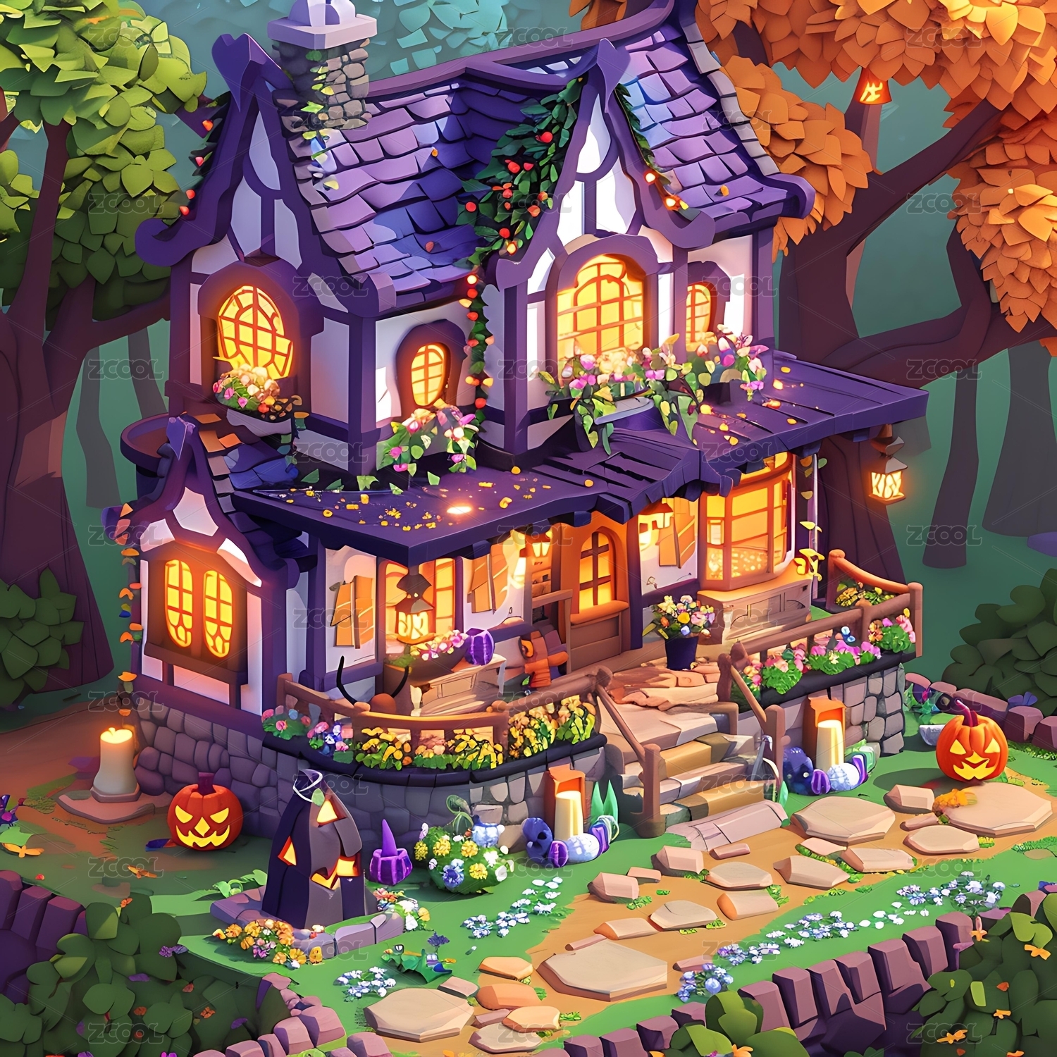 南瓜灯装饰的可爱万圣节小屋