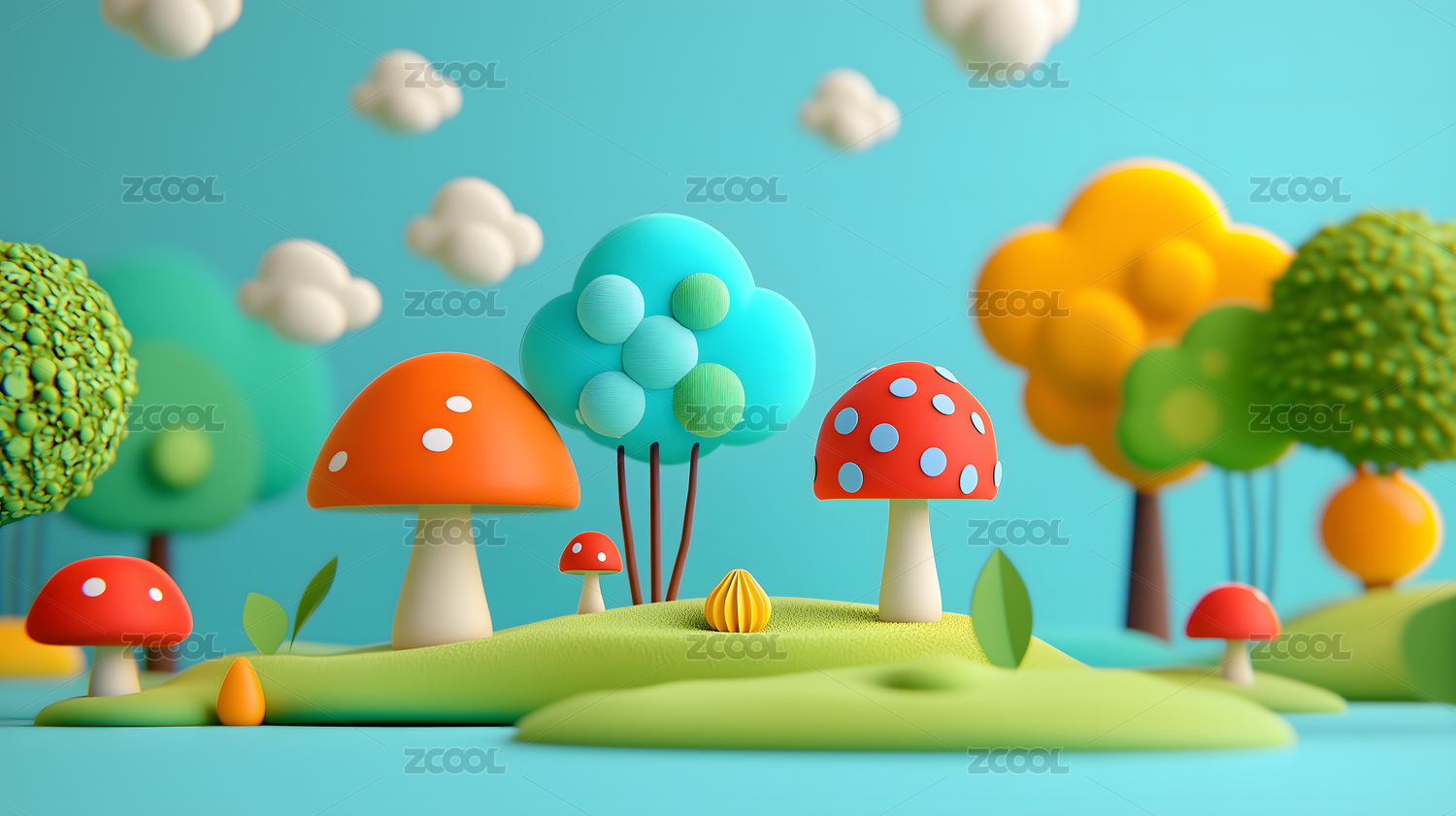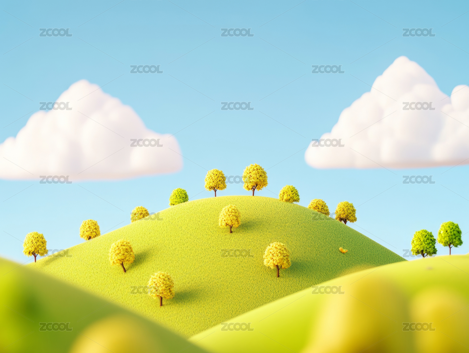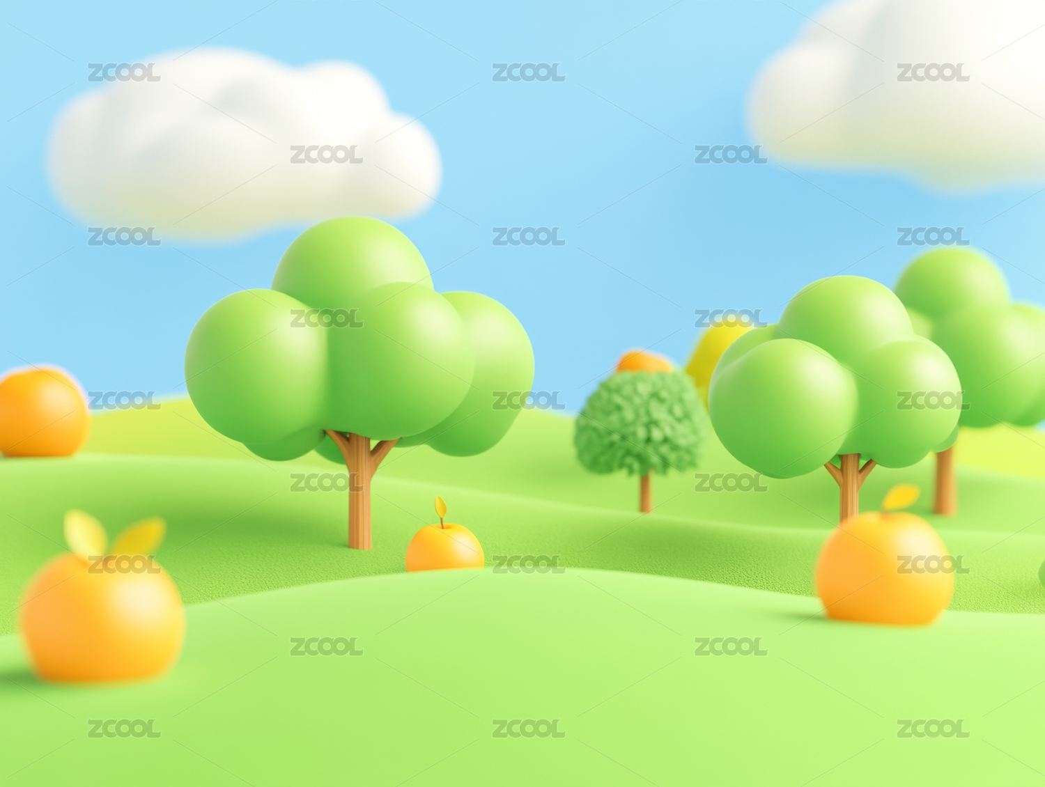 绿色,草地,树木,黄色,果实,云朵,蓝天,自然,景观,卡通