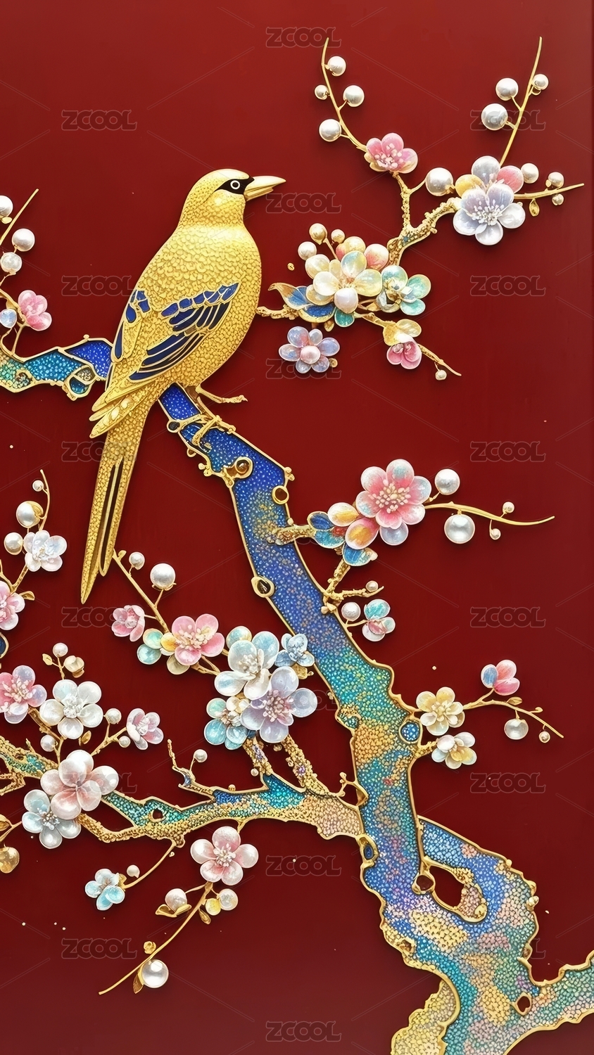 金色飞鸟和金色花枝图案