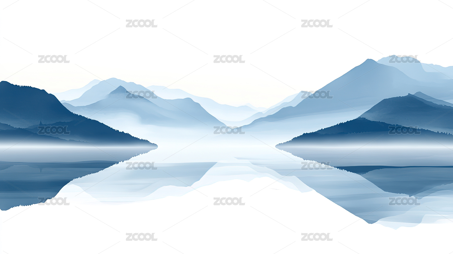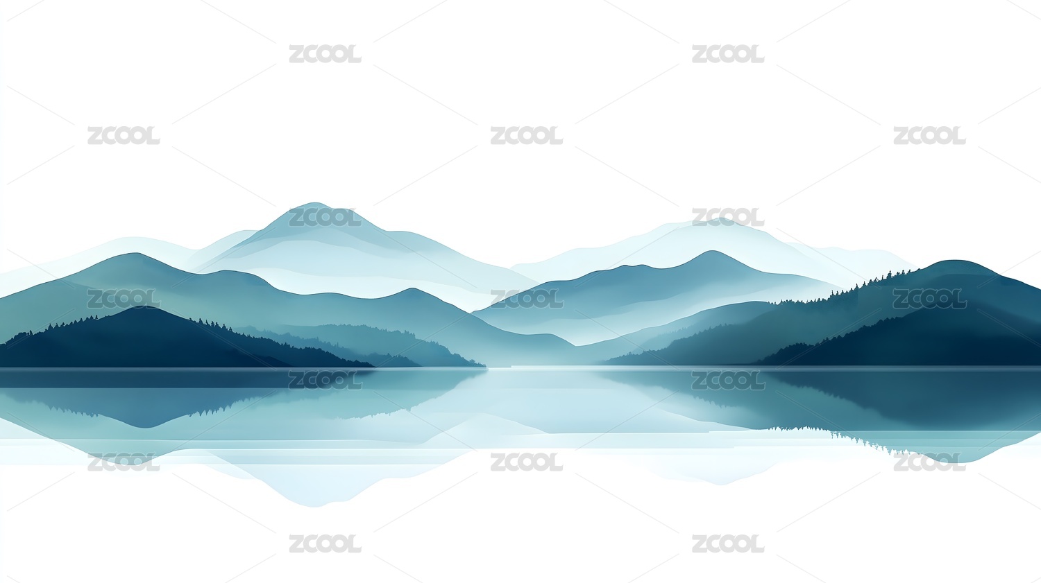 水墨山水倒影意境,层峦叠嶂青色朦胧