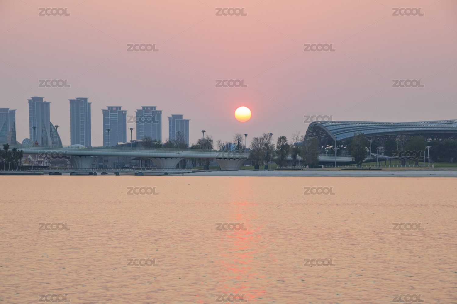 日落,黄昏,湖水,足球场,摩天轮,贺兰山,橙色,天空,湖面,公园