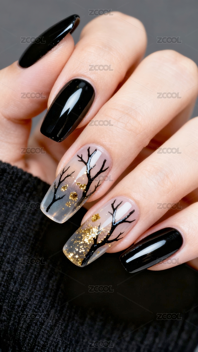 黑金伞花图案精致美甲