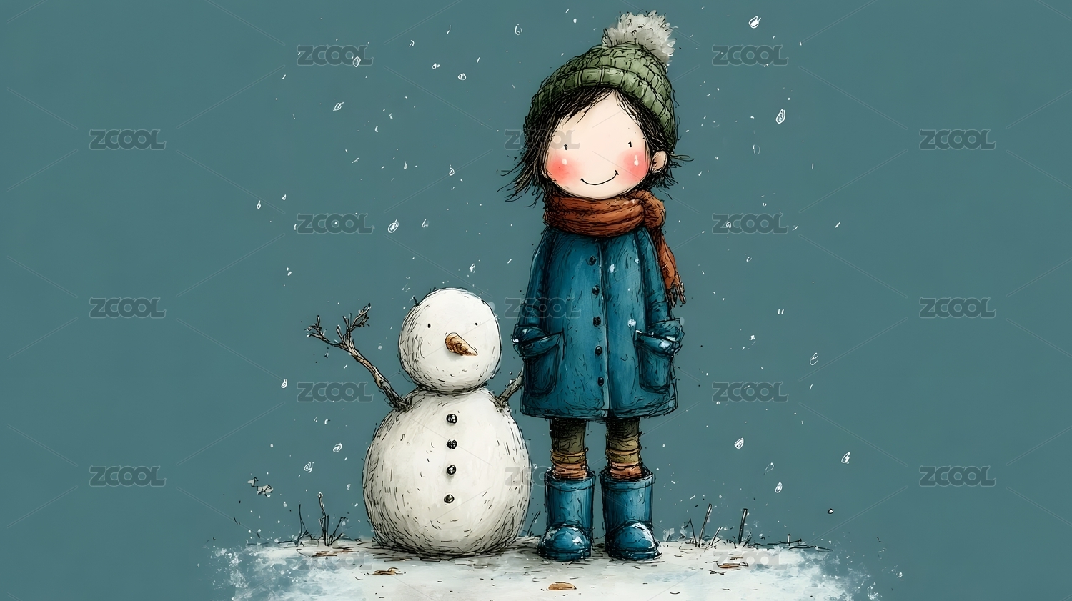 冬日里的小女孩与雪人