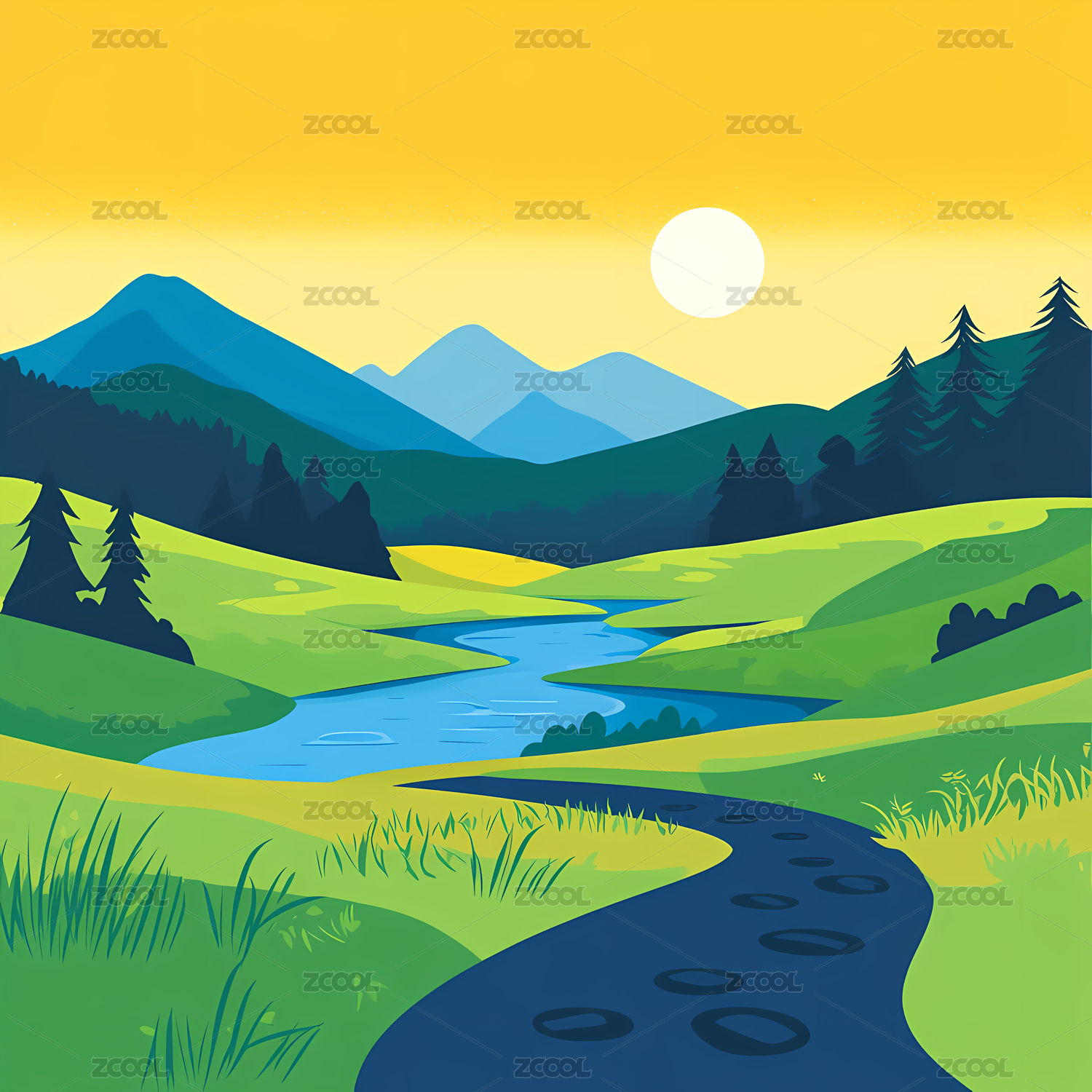 草地小溪插画