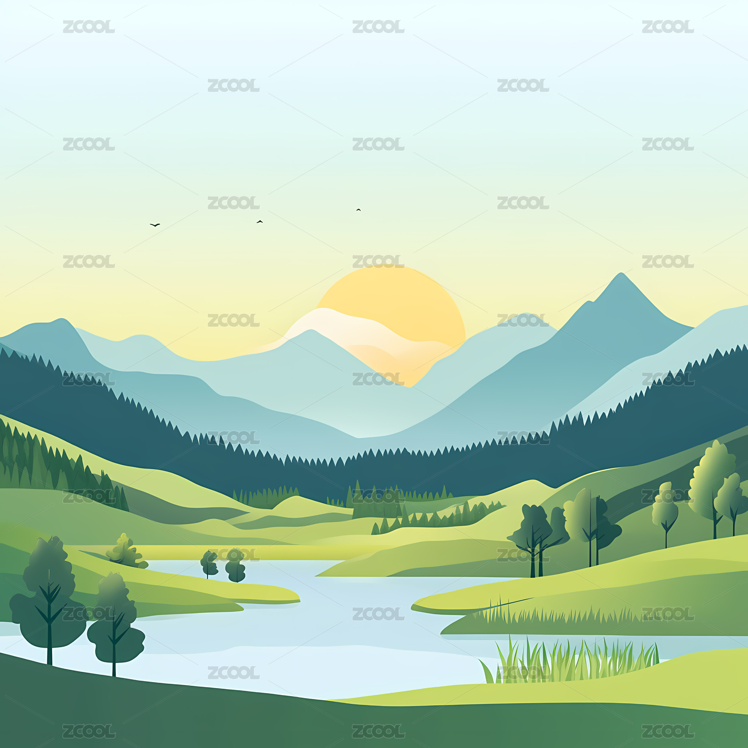绿色,自然,生态,宁静,远山,插画,风景,河流,草地,清新