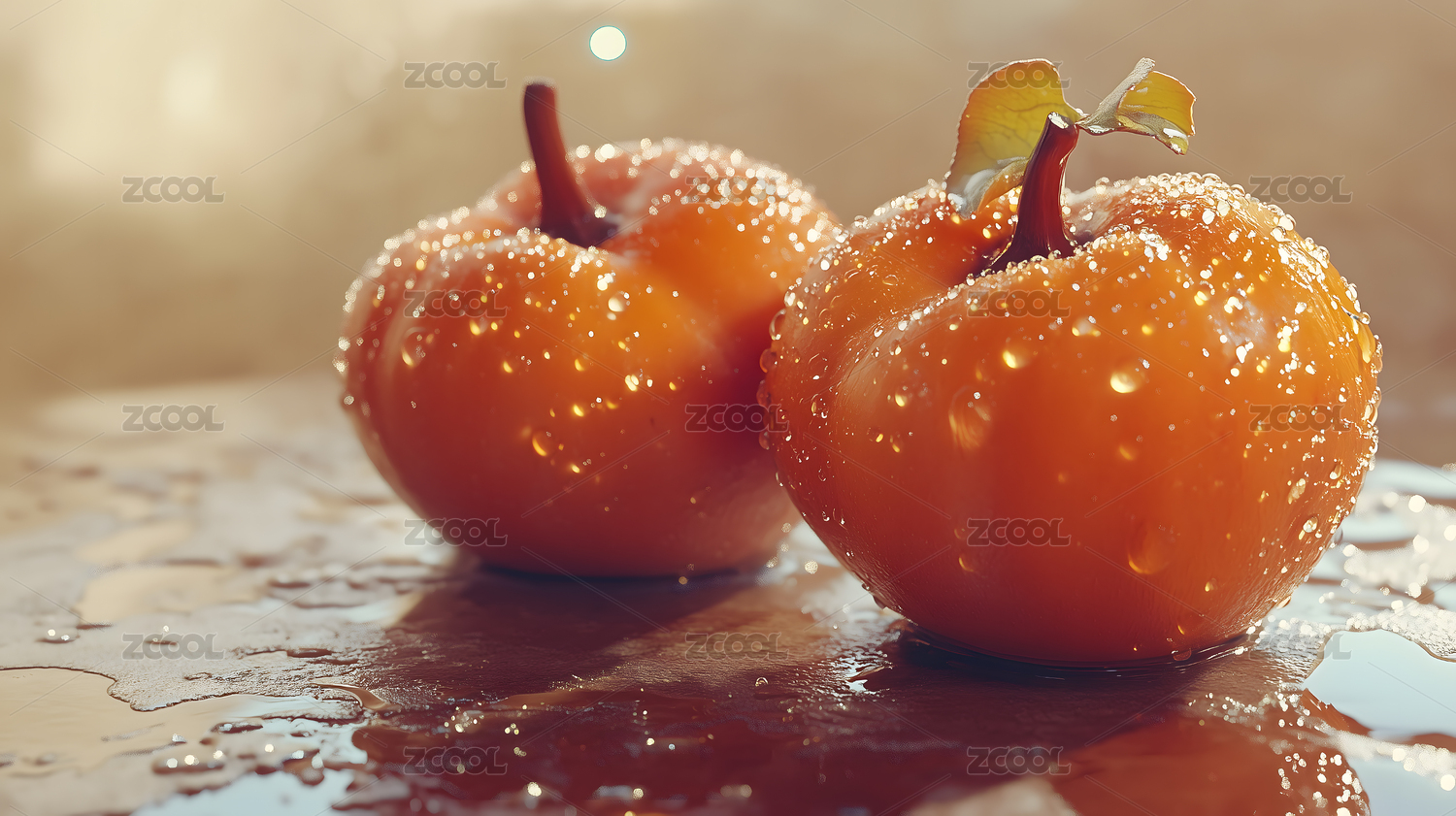 苹果,水珠,果柄,叶子,光泽,倒影,橙黄色,红色,圆润,光滑