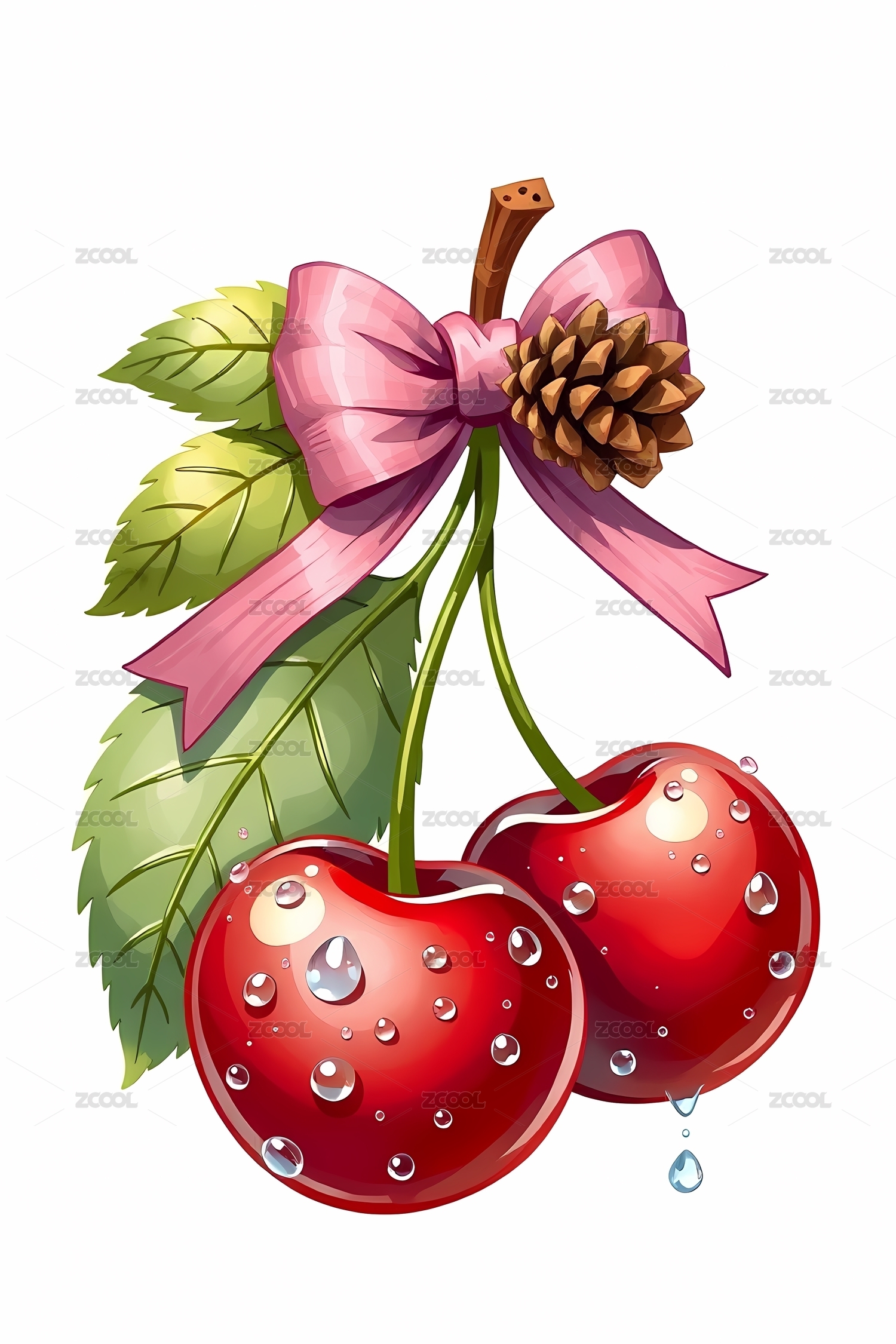 绿叶,水珠,白色,背景,果实,装饰,粉色,红色,蝴蝶结,气泡
