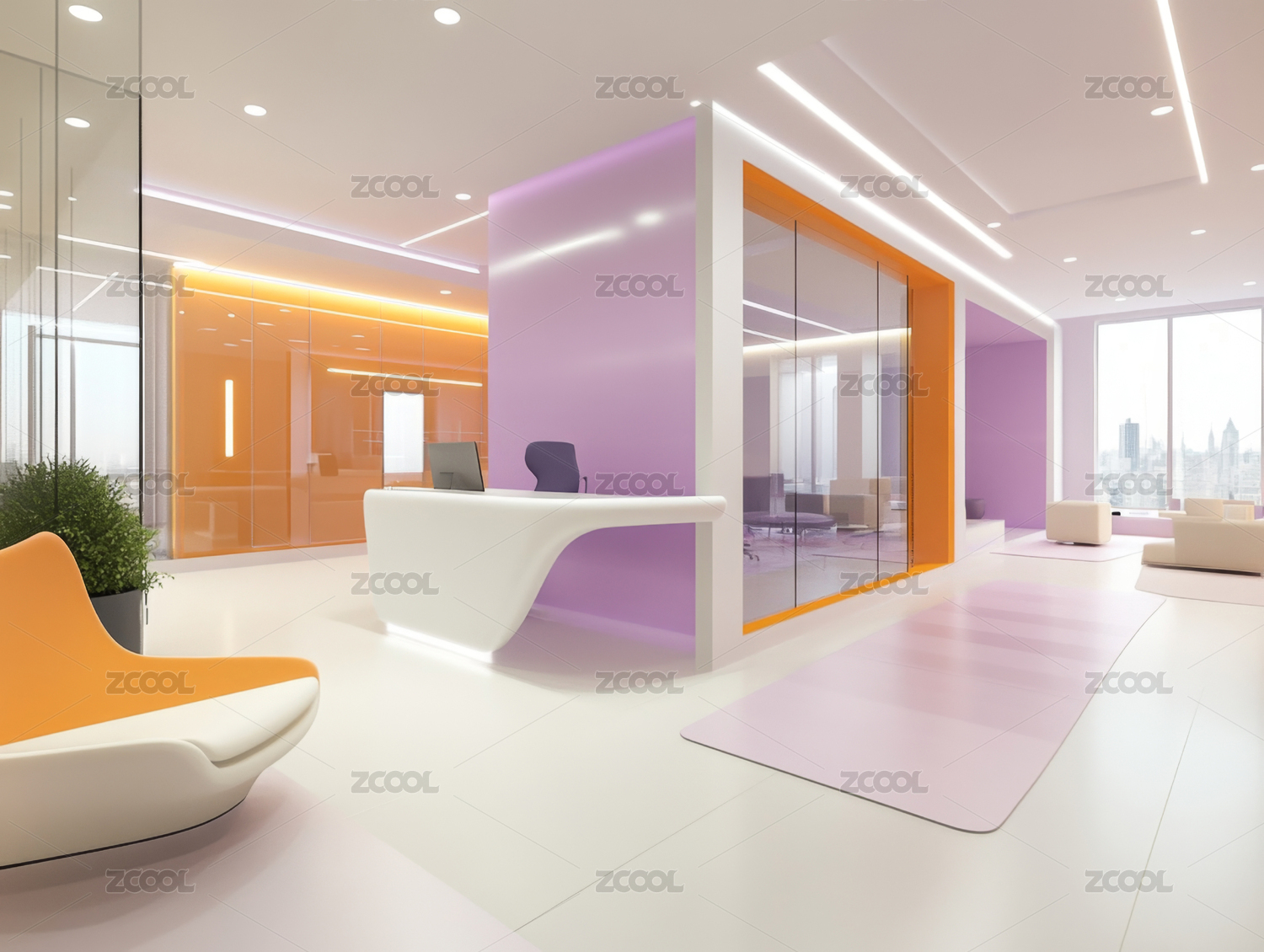 办公室,紫色,现代,设计,桌子,椅子,植物,灯光,玻璃,隔断